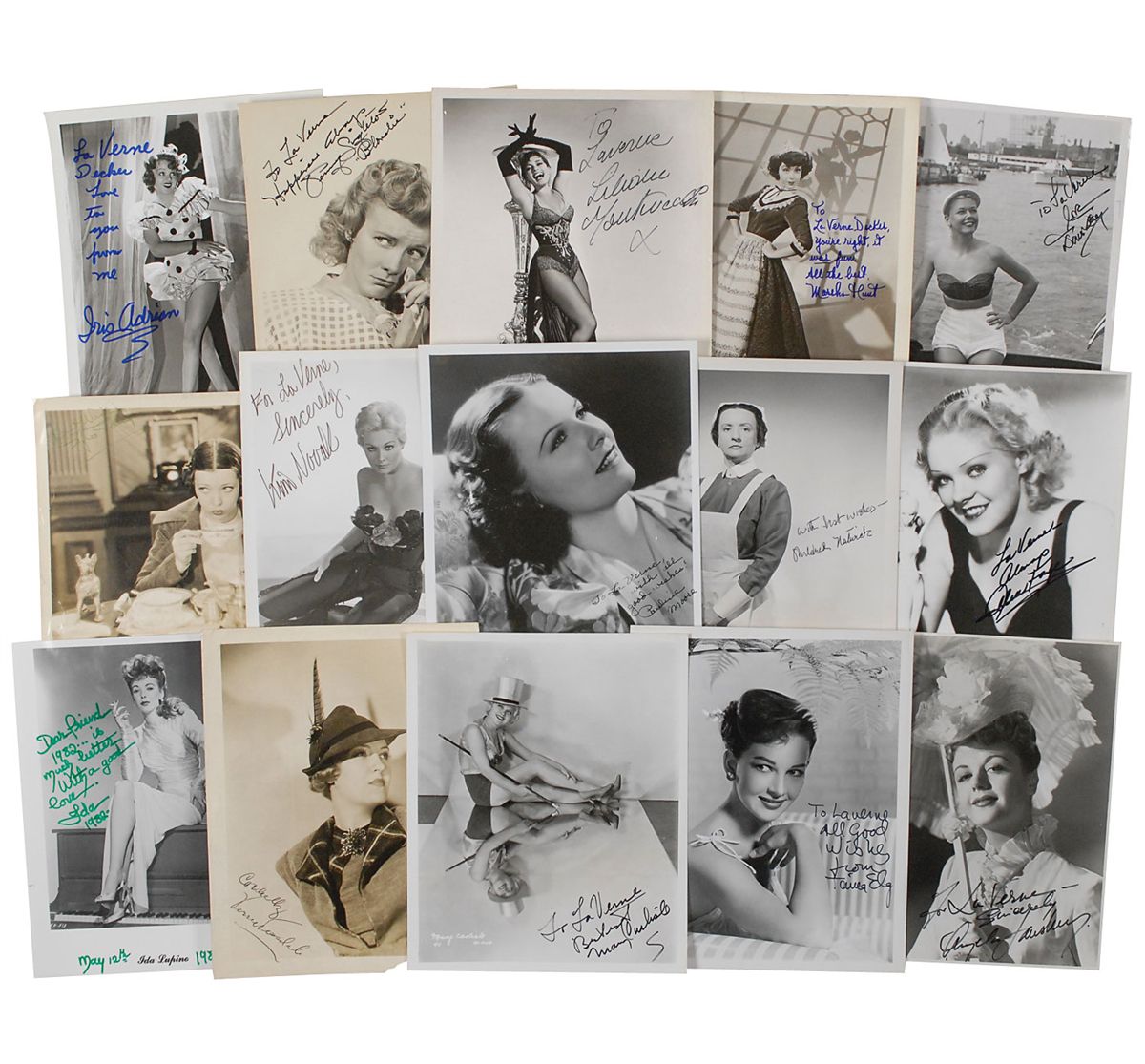 Collection of 15 photos of famous actresses, 8 x 10 and 10 x 8, each signed by the star pictured, including: Penny Singleton (ins), Sylvia Sidney, Kim Novak (ins), Mildred Natwick, Pauline Moore (ins), Liliane Montevecchi (ins), Ida Lupino (ins), Angela Lansbury (ins), Marsha Hunt (ins), Alice Faye (ins), Taina Elg (ins), Doris Day (ins), Mary Carlisle (ins), Iris Adrian (ins), and Verree Teasdale (ins). In overall fine condition, with various scattered creases and chipping to edges.