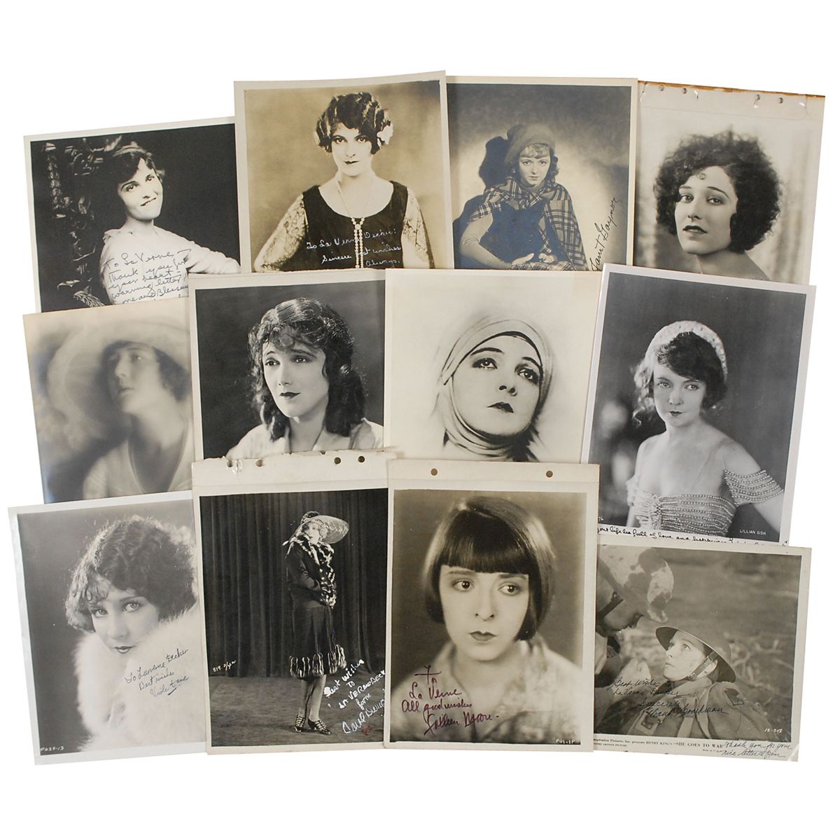 Collection of twelve photos, 8 x 10 and 10 x 8, each signed by the actress pictured, including: Carol Dempster (ins), Eleanor Boardman (ins), Viola Dana (ins), Priscilla Dean (ins), Janet Gaynor, Lillian Gish (2, ins), Jetta Goudal (ins), Georgia Hale (ins), Madge Kennedy (ins), Mary MacLaren (ins), and Colleen Moore (ins). In overall very good to fine condition, with various scattered creases, a few edge tears, and some trimmed edges.