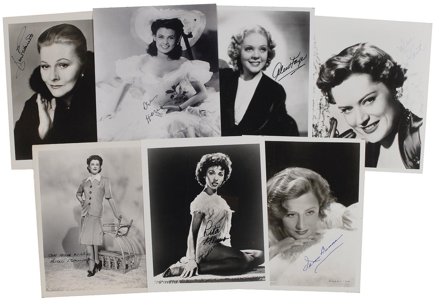 Seven signed glossy 8 x 10 photos, each signed in felt tip by the respective actress pictured. Signers are: Joan Fontaine, Irene Dunn, Alice Faye, Joan Bennett, Lena Horne, Rita Moreno, and Alexis Smith. In very good condition.