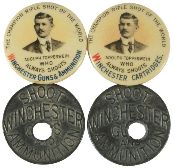 One pinback says "Champion Rifle Shot of the World Alway Shoots Winchester Guns & Ammunition" Pinback 2 says the same except "Winchester Cartridges" Two lead target coins say "Shoot Winchester Guns & Ammunition"