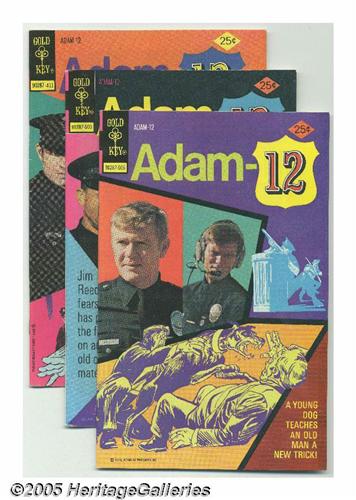<B>Adam 12 #1-10 File Copies Box Lot (Gold Key, 1973-76).</B></I> This full short box has multiples of the full run of this series, featuring art by Jack Sparling. Condition averages FN+ unless otherwise noted. Included here are 14 copies of #1, 15 copies of #2, 7 copies of #3, 16 copies of #4 (averaging VF condition), 21 copies of #5 (averaging VG/FN condition), 45 copies of #6, 21 copies of #7, 14 copies of #8, 13 copies of #9, 19 copies of #10, and a wacky bonus in the form of a VG/FN copy of <B>Munsters</B></I> #8. Approximate Overstreet value for group = $3,000.
