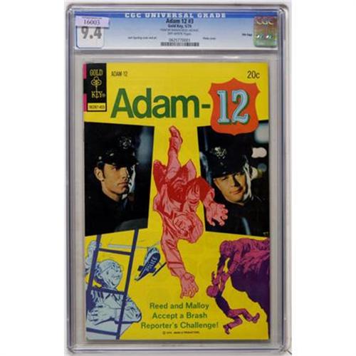 <B>Adam 12 #3 File Copy (Gold Key, 1974) CGC NM 9.4 Off-white pages.</B></I> Photo cover. Jack Sparling cover and art. CGC notes, "From the Random House Archives." Overstreet 2007 NM- 9.2 value = $45. CGC census 9/07: 6 in 9.4, 2 higher.<BR><BR><b>Shipping:</b> Comics - Slabbed (certified) (<a target="_blank" href="http://www.heritageauctions.com/common/shipping.php">view shipping information</a>)