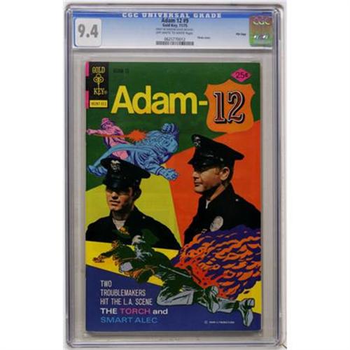 <B>Adam 12 #9 File Copy (Gold Key, 1975) CGC NM 9.4 Off-white to white pages.</B></I> Photo cover. CGC notes, "From the Random House Archives." Overstreet 2007 NM- 9.2 value = $45. CGC census 9/07: 6 in 9.4, none higher.<BR><BR><b>Shipping:</b> Comics - Slabbed (certified) (<a target="_blank" href="http://www.heritageauctions.com/common/shipping.php">view shipping information</a>)