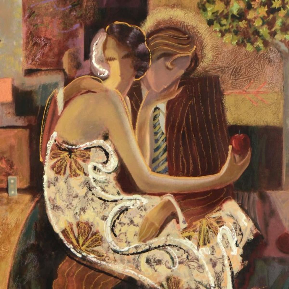 "Adam & Eve" is a limited edition hand embellished serigraph on canvas by Sabzi, numbered and hand signed by the artist. Includes Certificate of Authenticity. Measures approx. 40" x 50" (image).