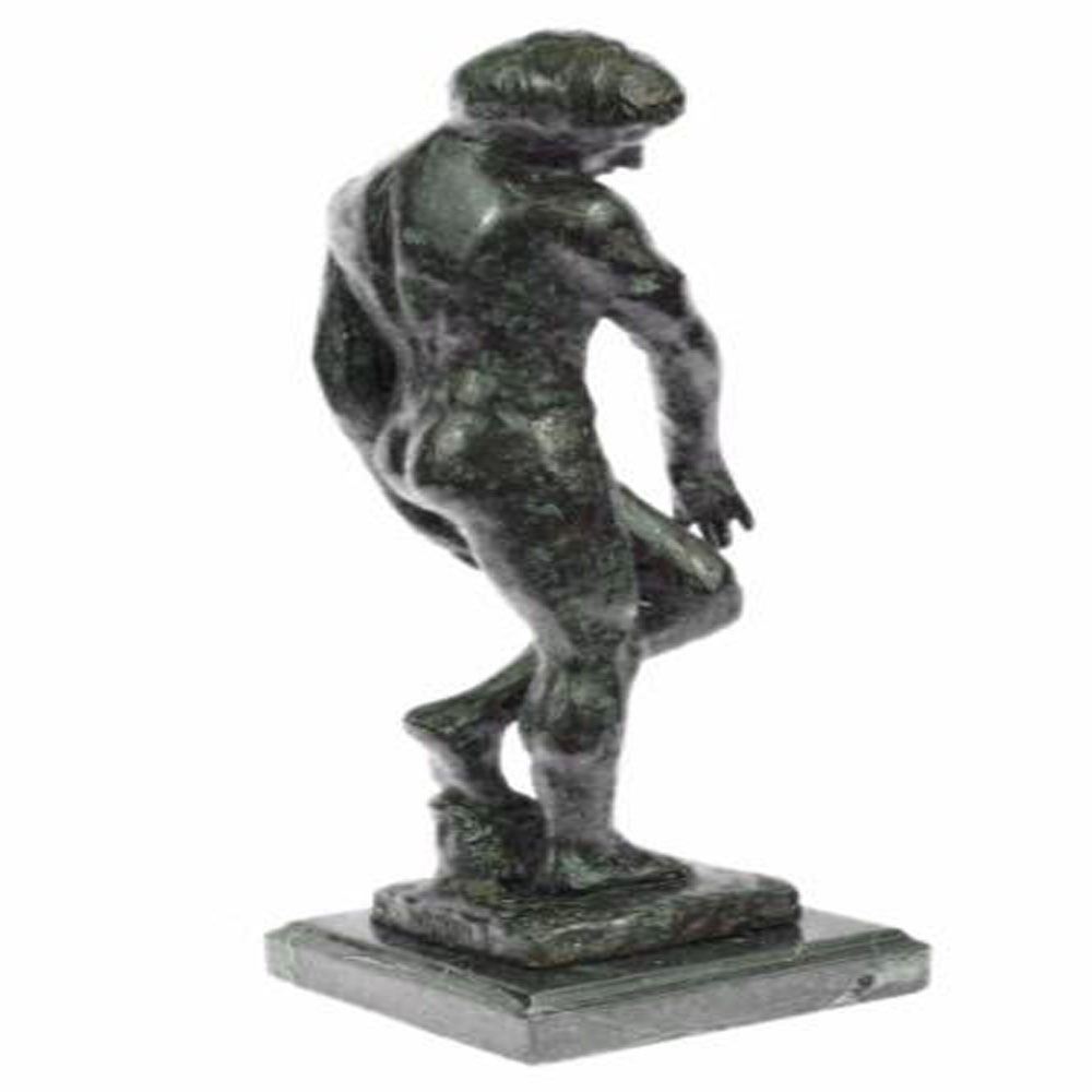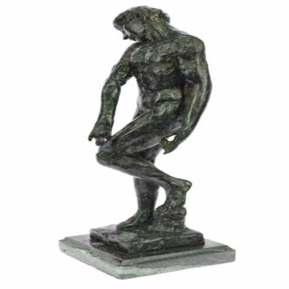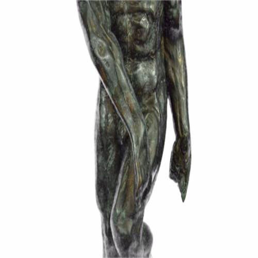 The Nude Man Can Be Imagined Stretching His Arms Among The Morning Sun Streaming In Through An Open Window. His Eyes Hold The Sleepiness Of His Dreams And A Certain Lightness Of Attitude. Through His Pose The Anatomy And The Muscular Movement Of The Body Is Perceived. He Was Fashioned Using The Ancient Method Of The lost wax Technique And Stained With A Greenish Patina Finish For Conservation He Stands Upon A Marble Base. Bronze Dimensions with Marble Base: Height 15 x Width 6 inches. Weight: 9 LBS.
