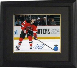 Adam Henrique currently plays for the New Jersey Devils in the NHL. He was selected by the New Jersey Devils in the third round, 82nd overall, in the 2008 NHL Entry Draft. In the first round of the Stanley Cup Playoffs Game 7 against Florida, Henrique scored 2 goals, 1 being the double overtime winner sending the Devils to the Conference Semifinals, becoming just the 2nd NHL rookie to score an overtime winning goal in a game seven. On May 25, 2012, Henrique scored 1:03 into overtime to eliminate the New York Rangers and send the Devils to the 2012 Stanley Cup Finals. This made him the first rookie to score two series-clinching overtime goals in the same playoffs. Adam Henrique has hand signed this New Jersey Devils 8x10 Photo. Leaf Authentics Hologram and Certificate of Authenticity from Athlon Sports. Custom Black Mat and Premium Black Frame as shown.