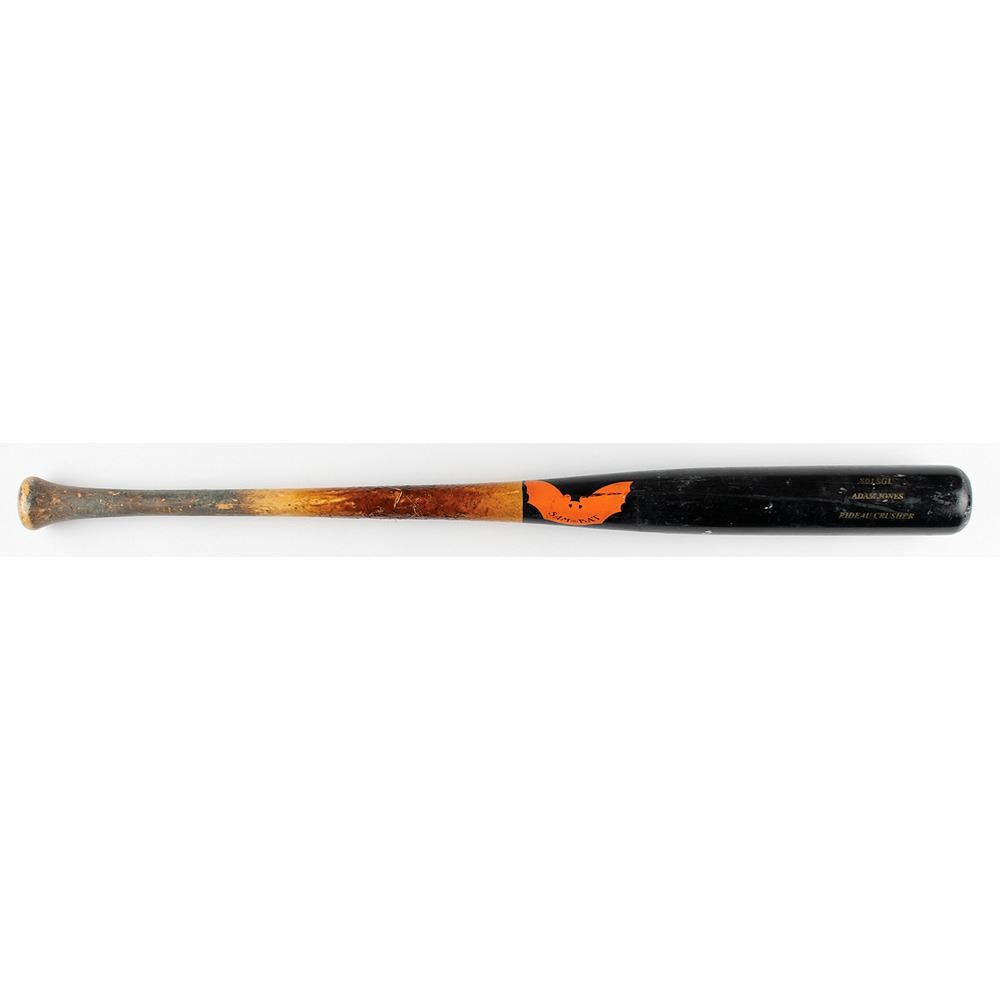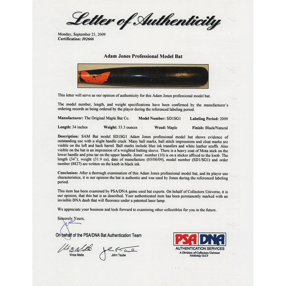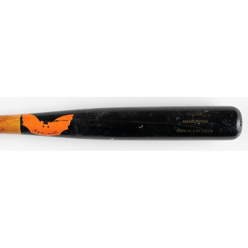 Adam Jones's game-used personalized SAM Bat SD1SG1 ‘Adam Jones’ Rideau Crusher baseball bat, used by Jones as a member of the Baltimore Orioles during the 2009 season. The end of the knob bears his No. 10 sticker, and the top of the barrel is marked with length (34˝), weight (31.9 oz), manufacture date (May 2009), model, and order number (8847). In very good to fine condition, with obvious expected signs of use. Accompanied by a full letter of authenticity from PSA/DNA that concludes that “the bat is authentic and was used by Jones during the referenced labeling period.” In the 2009 season, Jones recorded his first Gold Glove award as well as his first All-Star Game selection.