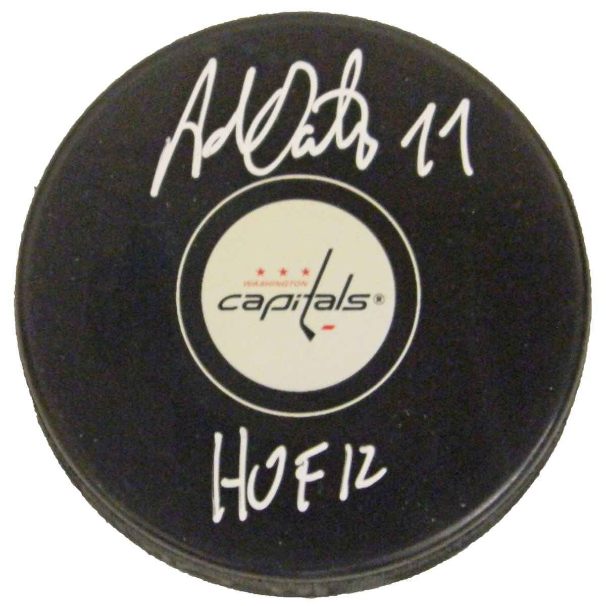Adam Oates signed Washington Capitals logo hockey puck with 'HOF 12' inscription. Item comes with a Schwartz Sports Memorabilia tamper-proof numbered hologram and Certificate of Authenticity which can be verified online.