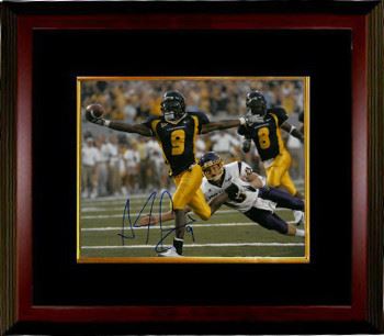 Adam Jones appeared in all 13 games in 2003, starting nine at cornerback, and taking over full-time kick return and punt return duties. As a junior in 2004, he was the secondary captain and led the team in tackles and interceptions. Jones also played briefly on offense, as well as returning punts and kick-offs for the second season. Jones is ranked second on West Virginia's career kickoff return yardage list with 1,475 yards. He is also ranked eleventh on the school's career punt return yardage list with 404 yards, while his 10.92 yards per punt return is the sixth most in school history. Jones is one of the highest West Virginia players drafted. Adam Jones has hand signed this West Virginia Mountaineers 8x10 Photo. Certificate of Authenticity from Athlon Sports. Custom Black Mat and Premium Mahogany Frame as shown.