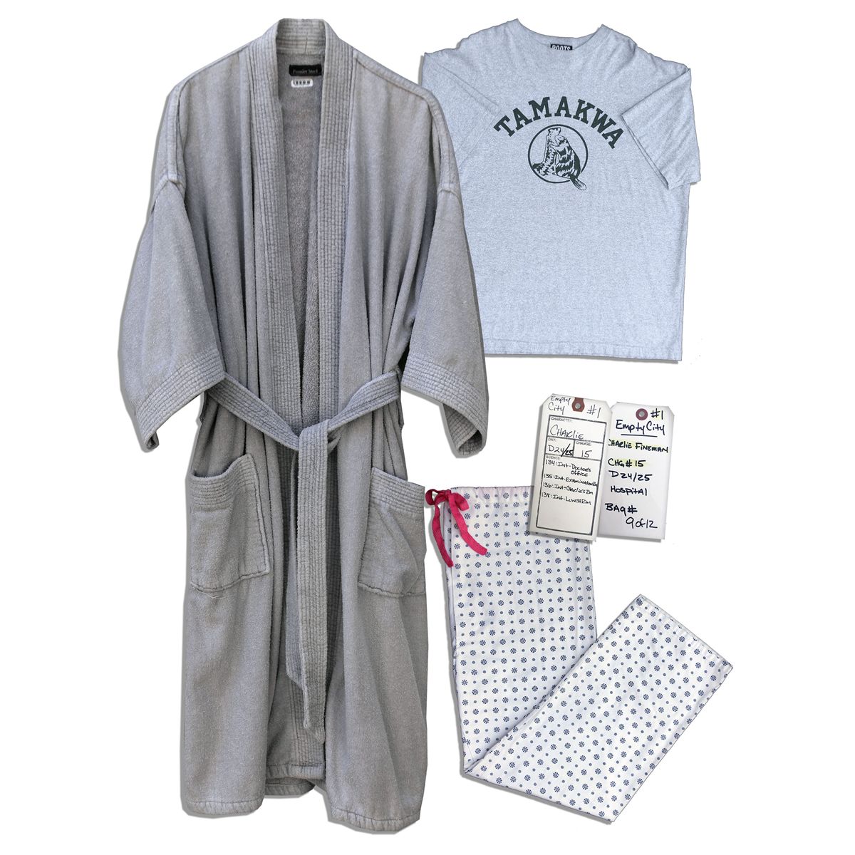 Adam Sandler costume from the 2007 drama, ''Reign Over Me''. Sandler played ''Charlie Fineman'' in the film, a widower recovering from post 9/11 trauma. Costume includes a ''Premiere Stock'' brand grey terrycloth robe, one size fits all, with a Sony Studios sticker intact beneath tag, a ''Roots Athletics'' brand t-shirt, size XL, and pair of ''Fashion Seal'' hospital pajama pants, size XL. Original wardrobe tag intact. Near fine. With a color photocopy of the COA from Columbia Pictures.
