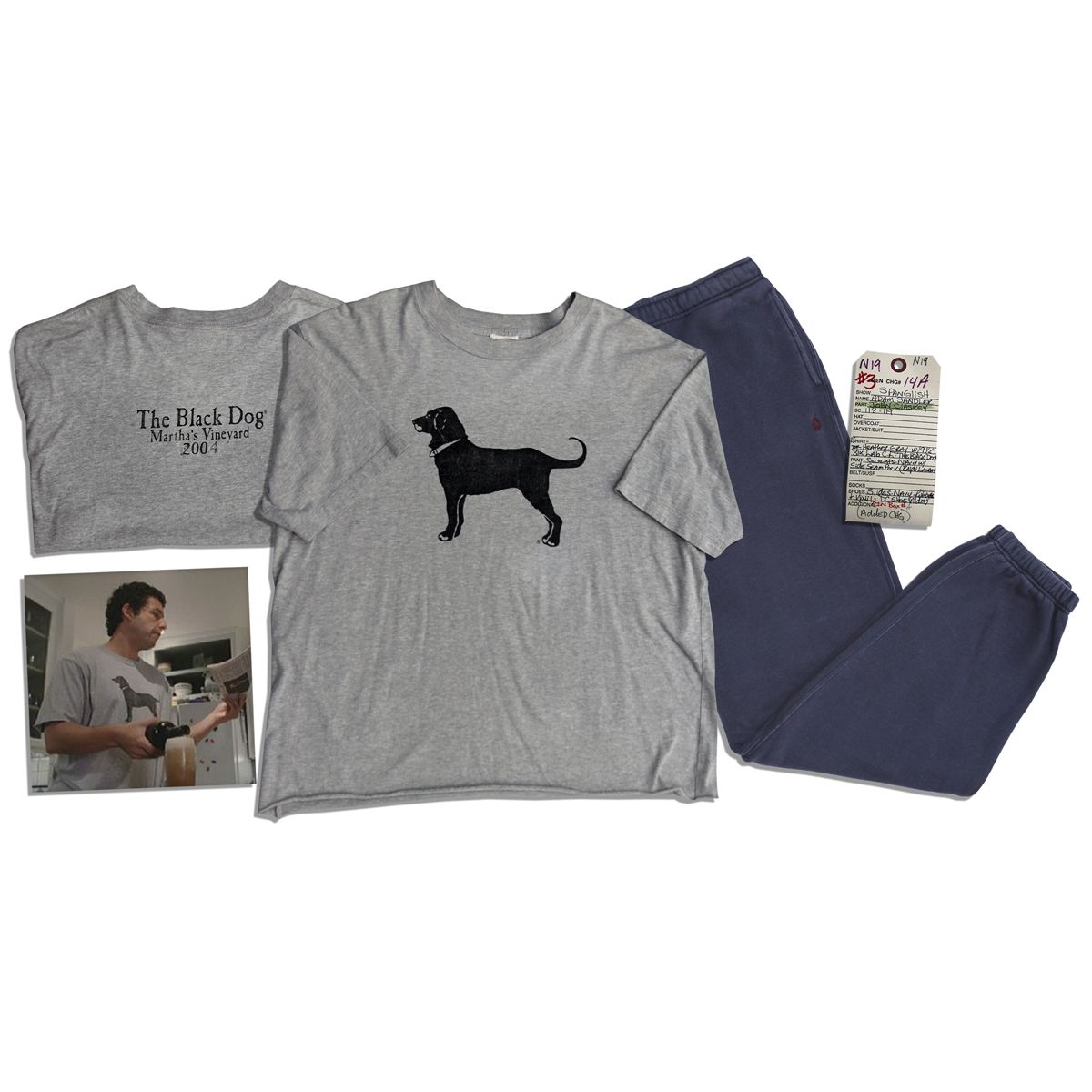 Adam Sandler production used wardrobe from ''Spanglish''. Sandler starred in the 2004 picture as an affluent Los Angeles family man and successful chef. Two-piece ensemble comprises a pair of navy blue elasticized waist sweatpants by Polo in size XL and a grey Marta's Vineyard 2004 t-shirt with a black dog graphic on the front in approximate size XL. Light wear, else near fine. With costume department's tag and a color photocopy of the COA from Columbia Pictures.
