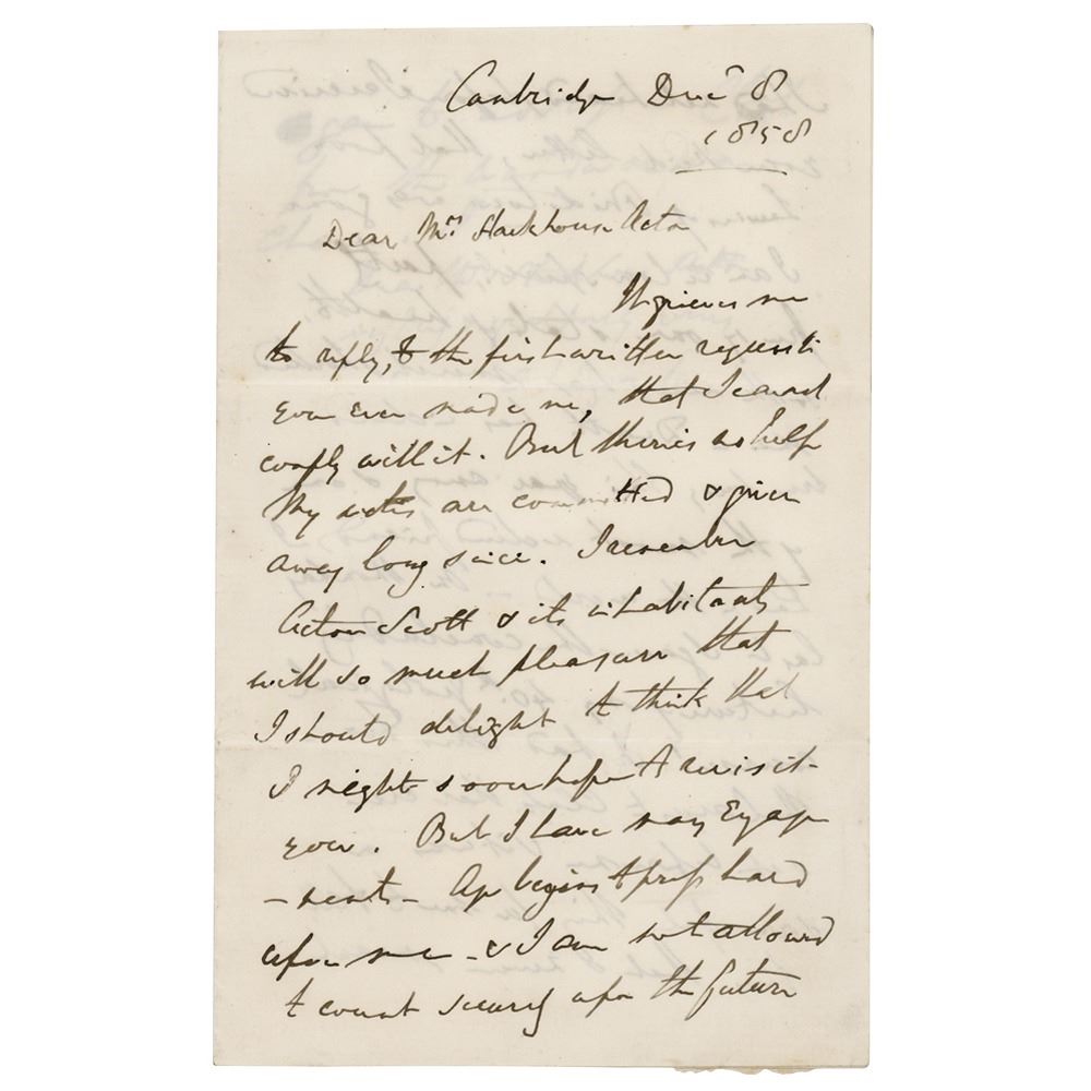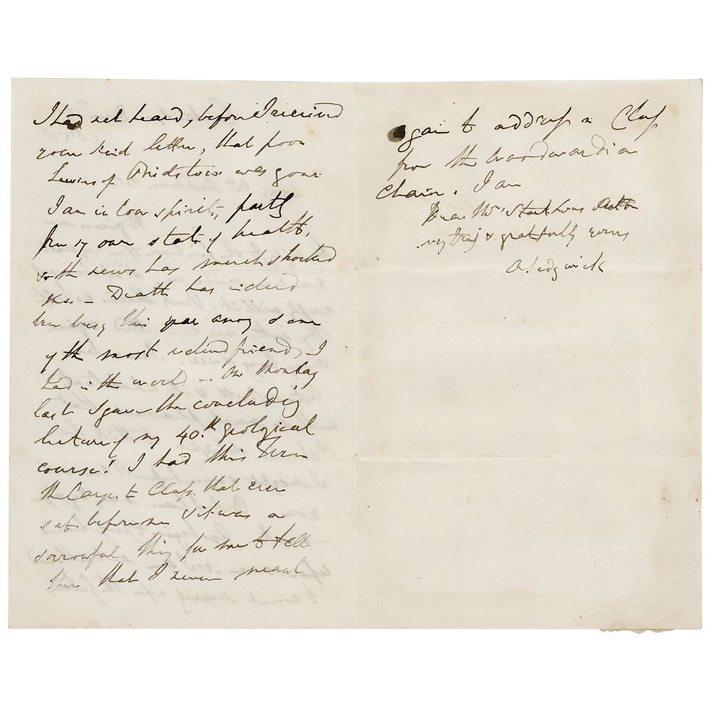 ALS signed "A. Sedgwick," three pages on two adjoining sheets, 4.5 x 7, no date. Addressed from Cambridge, a handwritten letter to British botanist and archaeologist Frances Stackhouse Acton, in part: "I remember Acton Scott & its inhabitants with so much pleasure that I should delight to think that I might soon hope to revisit you. But…age begins to press hard upon me…I had not heard, before I received your kind letter, that poor Lewis…was gone. I am in low spirits, partly from my own state of health, & the news has much shocked me. Death has indeed been busy this year…On Monday last I have the concluding lecture of my 40th geological course! I had this term the largest class that ever set before me. It was a sorrowful thing for me to tell them that I never…again to address a class from the Woodwardian Chair." In very good to fine condition, with light show-through on the last from old mounting remnants on the back. Across all formats, this letter represents our first signed item from Sedgwick, who, in 1818, became the Woodwardian Professor of Geology at Cambridge, holding the chair until his death in 1873. His biography in the Cambridge Alumni database says that upon his acceptance of the position, reverend Sedgwick had no working knowledge of geology.