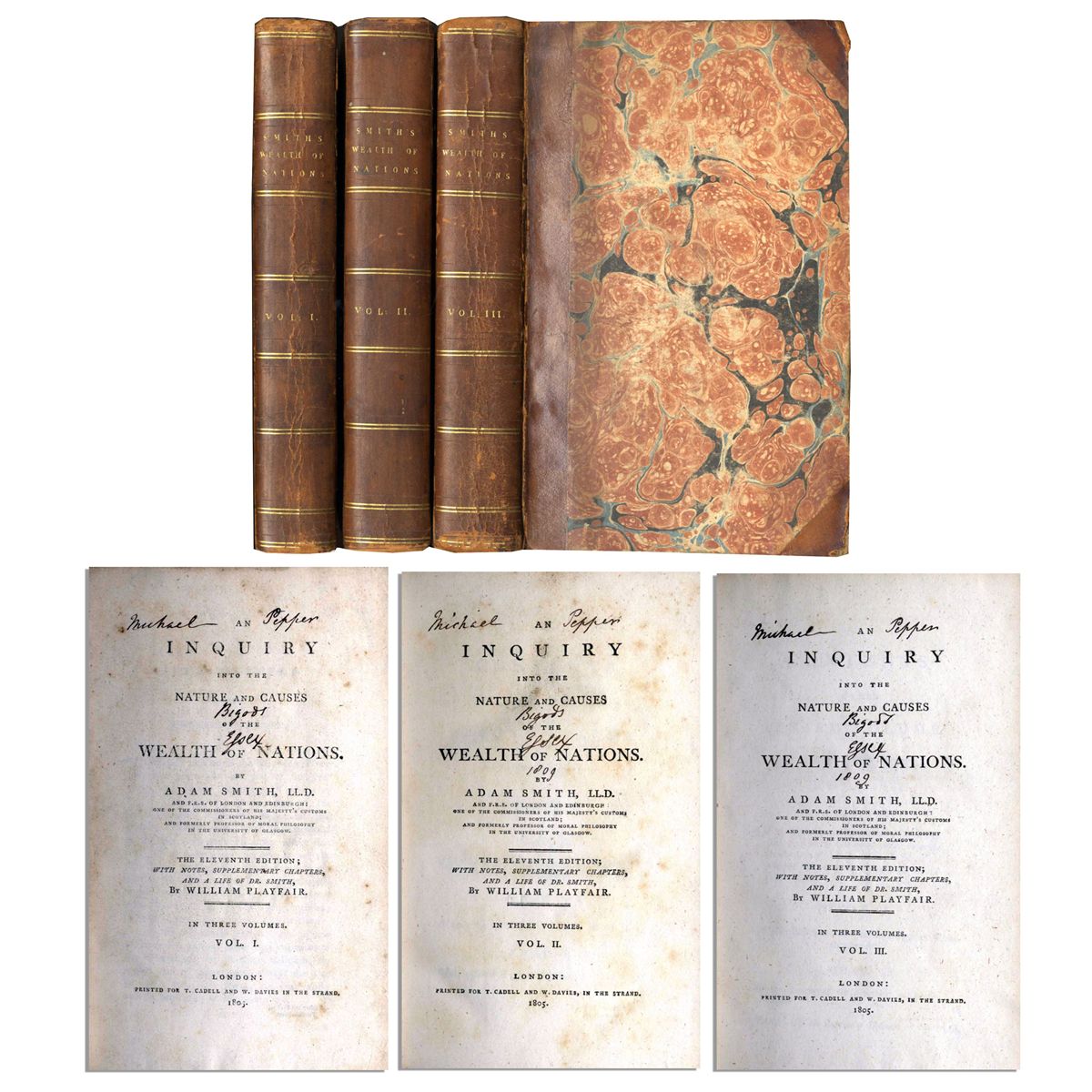'An Inquiry Into the Nature and Causes of the Wealth of Nations'' by Scottish economist and professor of moral philosophy Adam Smith. The three volume eleventh edition was published in 1805 by T. Cadell and W. Davies. Originally published in 1776 in London, during the British Agricultural Revolution and at the beginning of the Industrial Revolution, Smith's magnum opus is a powerful statement in favor of the free market and laissez-faire government economic policy. It influenced not only other economists but also politicians and government officials, both then and now. Thomas Jefferson wrote two years after this edition was published: ''...on the subjects of money & commerce, Smith's Wealth of Nations is the best book to be read...'' The 5.5'' x 8.5'' volumes with original marble boards and leather quarter bindings are lettered in gilt. Significant wear to boards and soiling to pastedowns and endpapers. Nice tight bindings and clean pages with minor foxing. Very good plus condition.