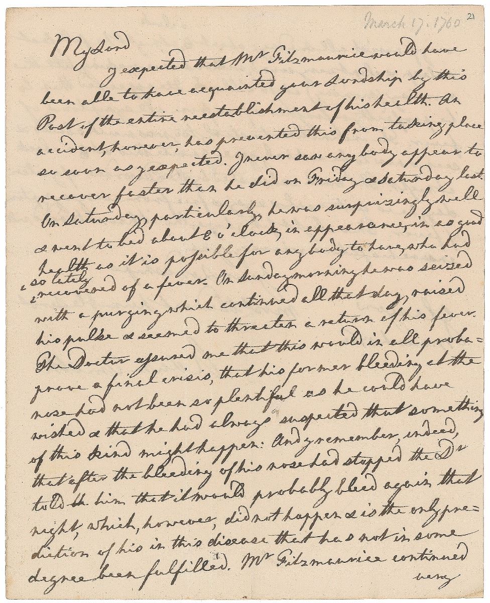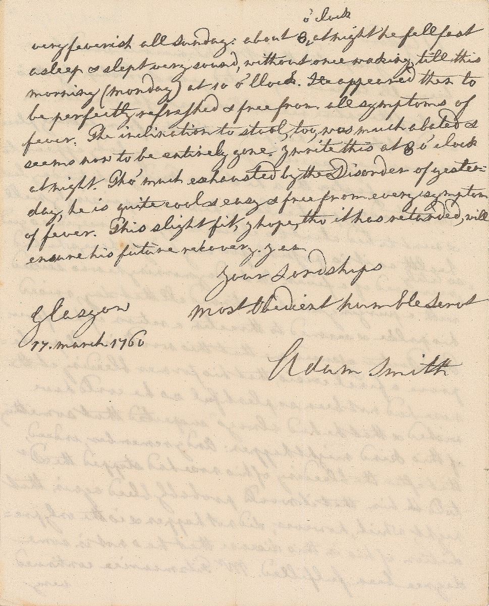 During his tenure as a professor of logic and moral philosophy at Glasgow University, Smith graciously offered to share his residence with students who sought both housing and scholastic supervision, a tender he would uphold over the course of thirteen years. Beginning in 1759, Thomas Petty-Fitzmaurice, the youngest son of the 1st Earl of Shelburne, lodged and studied with Smith for two years before eventually moving on and becoming a Member of Parliament in 1761. Published in April of 1759, The Theory of Moral Sentiments, Smith’s landmark book of ethical philosophy, embodied many of his Glasgow lectures, which in turn enhanced the standing of both the institution and Smith, whose noted genius and influential teachings attracted a generation of young minds to transfer to Glasgow. Representative of the unique concern Smith relayed to his students, this is an exceptionally rare and considerate letter penned less than a year after the publication of his classic work of sentiment and sympathy.