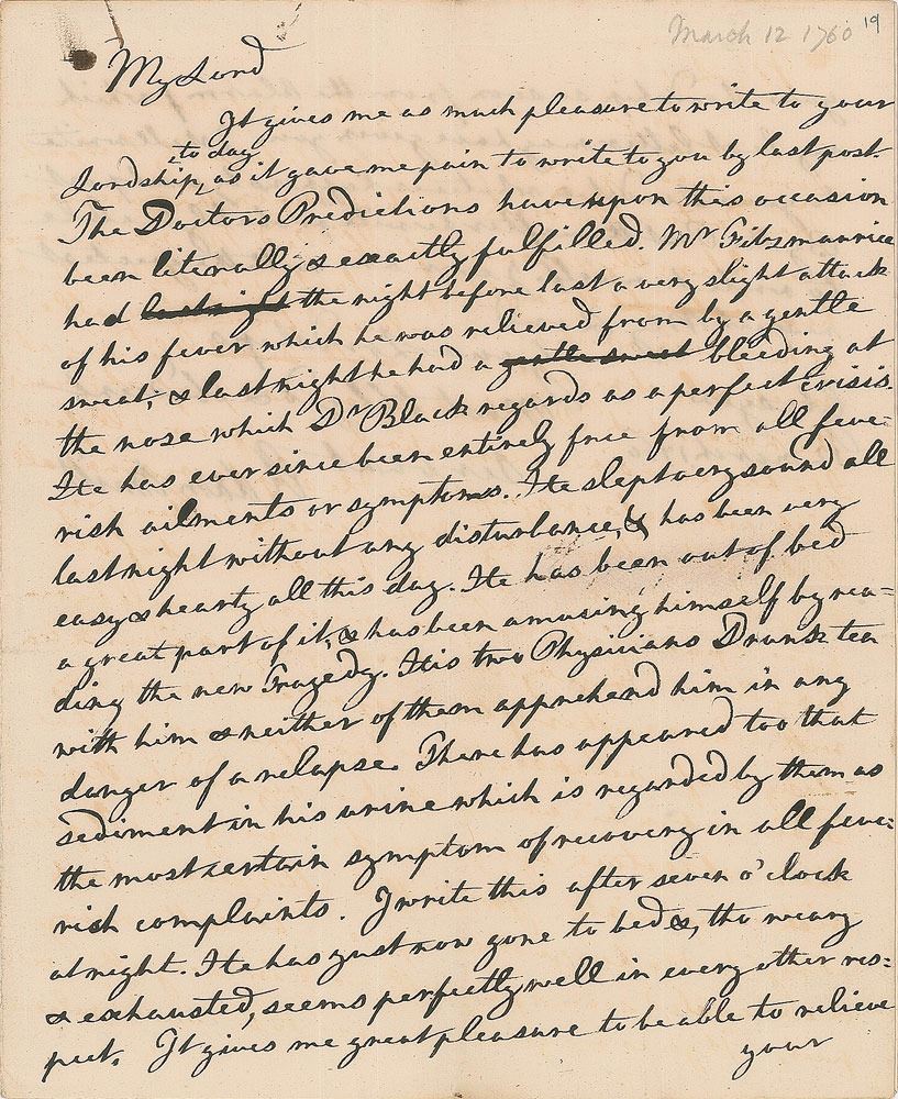 Scottish moral professor and a respected pioneer of political economy (1723-1790) whose magnum opus, The Wealth of Nations, is considered the first modern work of economics. Rare and boldly penned ALS, one page both sides, 7.25 x 9, March 12, 1760. Letter to the 1st Earl of Shelburne regarding the health of his son Thomas, then Smith's student and lodger, in full: "It gives me as much pleasure to write to your Lordship today as it gave me pain to write to you by last post. The Doctors Predictions have upon this occasion been literally and exactly fulfilled. Mr. Fitzmaurice had the night before last a very slight attack of his fever which he was relieved from by a gentle sweat; & last night he had a bleeding at the nose which Dr. Black regards as a perfect crisis. He has since been entirely free from all feverish ailments or symptoms. He slept very sound all last night without any disturbance, & has been very easy & hearty all this day. He has been out of bed a great part of it, & has been amusing himself by reading the new Tragedy. His two Physicians Drank tea with him & neither of them apprehend him in any danger of a relapse. There has appeared too that sediment in his urine which is regarded by them as the most certain symptom of a recovery in all feverish complaints. I write this after seven o'clock at night. He has just now gone to bed, the weary & exhausted, seems perfectly well in every other respect. It gives me great pleasure to be able to relieve your Lordship so soon from the alarm which my last letter may have given you. I shall write to your Lordship whatever happened by next post. By the Post thereafter he will probably be able to write himself." In fine condition, with partial splitting along the hinge and multiple vertical folds.