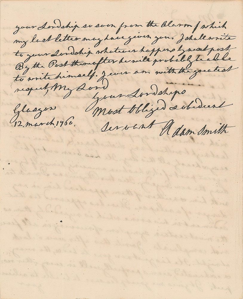 During his tenure as a professor of logic and moral philosophy at Glasgow University, Smith graciously offered to share his residence with students who sought both housing and scholastic supervision, a tender he would uphold over the course of thirteen years. Beginning in 1759, Thomas Petty-Fitzmaurice, the youngest son of the 1st Earl of Shelburne, lodged and studied with Smith for two years before eventually moving on and becoming a Member of Parliament in 1761. Published in April of 1759, The Theory of Moral Sentiments, Smith's landmark book of ethical philosophy, embodied many of his Glasgow lectures, which in turn enhanced the standing of both the institution and Smith, whose noted genius and influential teachings attracted a generation of young minds to transfer to Glasgow. Representative of the unique concern Smith relayed to his students, this is an exceptionally rare and considerate letter penned less than a year after the publication of his classic work of sentiment and sympathy.