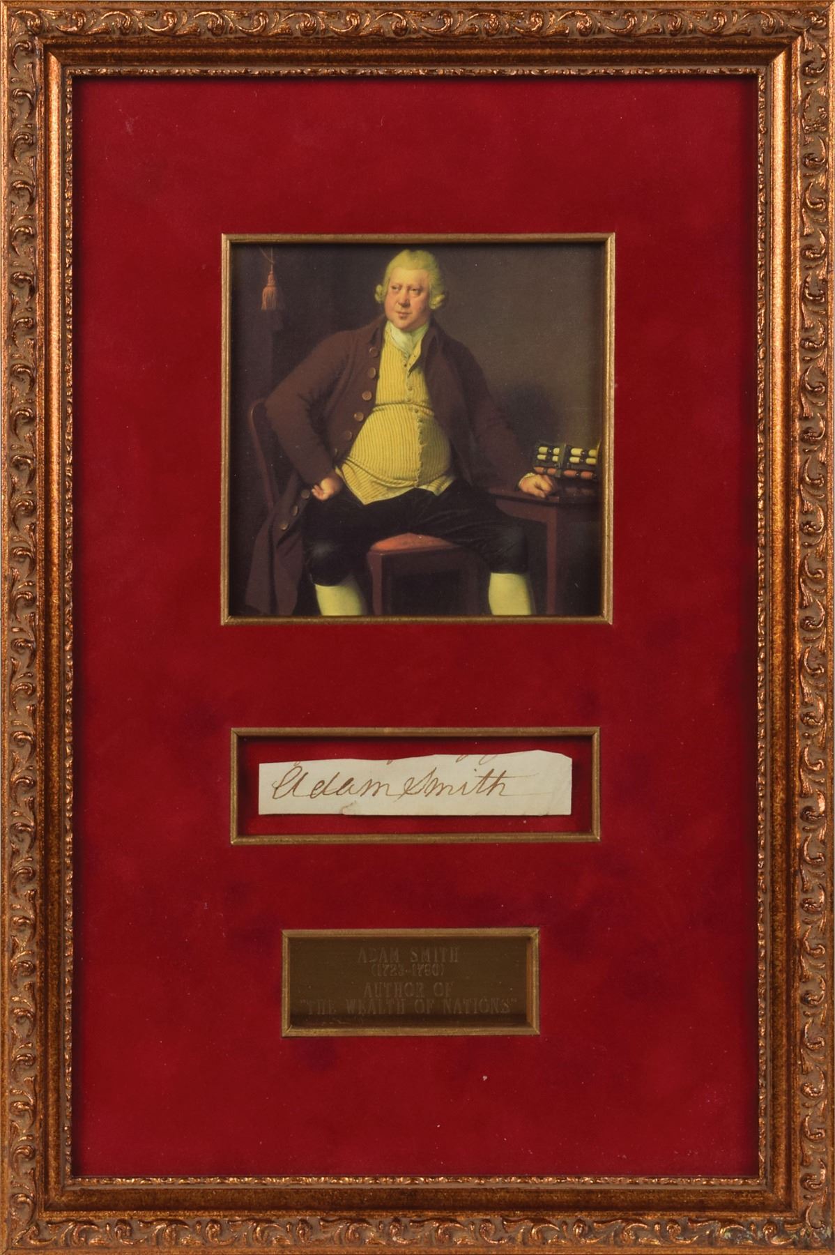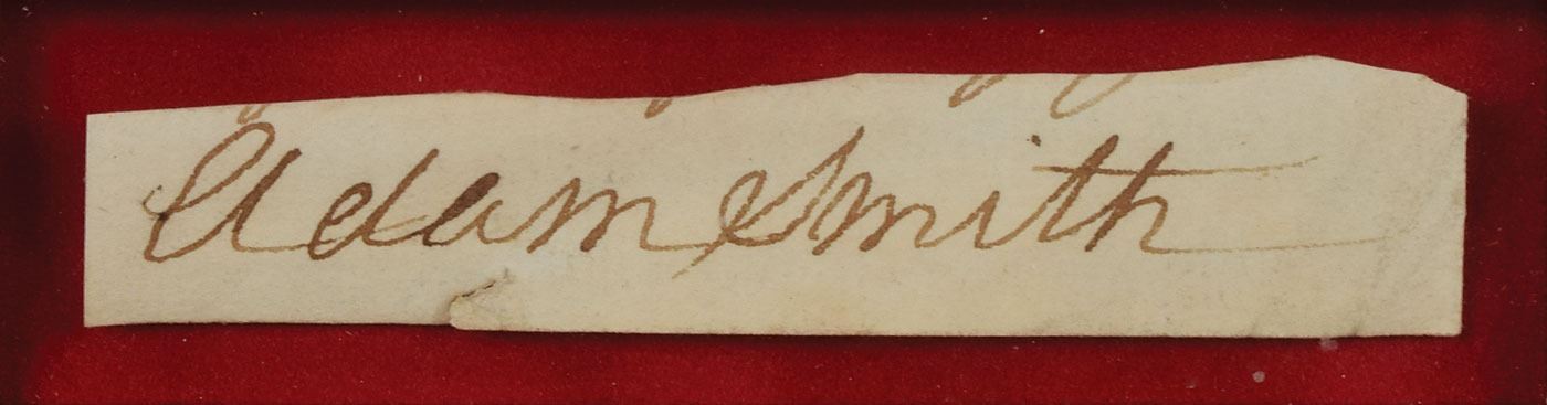 Scottish moral professor and a respected pioneer of political economy (1723–1790) whose magnum opus, The Wealth of Nations, is considered the first modern work of economics. Rare, prominent ink signature, "Adam Smith,” on an off-white 3.5 x .5 slip clipped from a letter. Handsomely mounted, suede-matted, and framed with a plaque and portrait to an overall size of 9.5 x 14. In fine condition, with a small edge tear beneath his first name. While we have offered Smith's letters in the past, this is the first clipped signature of the renowned economist that we have offered—an outstanding piece from a foundational intellectual.