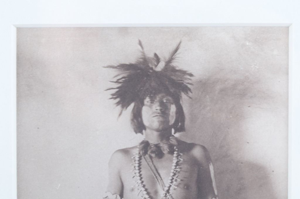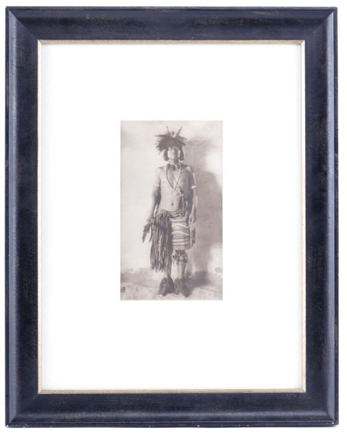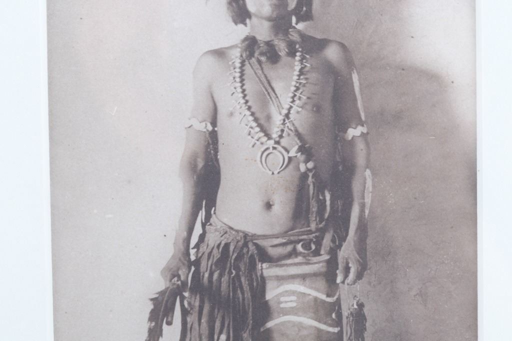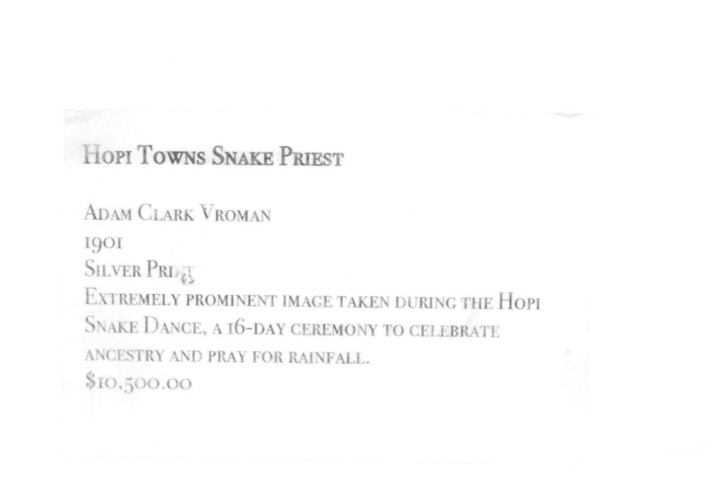 Featured in this lot is this gelatin silver called "Hopi Town Snake Priest," from Adam Clark Vroman (born in 1856 and passed in 1916) circa 1901. The photograph shows a Hopi Native American Snake Priest in ceremonial garments with a squash blossom around his neck and carrying a dancing wand. This is an extremely prominent photograph taken during the Hopi Snake Dance, which is a 16-day ceremony to celebrate ancestry and pray for rainfall. The condition of this gelatin silver is good, with no obvious signs of damage. The measurements of this framed silver gelatin are 18 1/4" x 14 1/2" and the visible art measures 7 7/8" x 4 1/2". Provenance: From the renowned Sundog Fine Art Bozeman, Montana collection and collected by Bruce VanLandingham. Bruce VanLandingham was a pillar in the American Indian collecting community and a respected expert. Along with being an avid collector, Bruce also was the sole owner of Sundog Fine Art Gallery in Bozeman, which was both part museum and gallery. Truly an outstanding example.