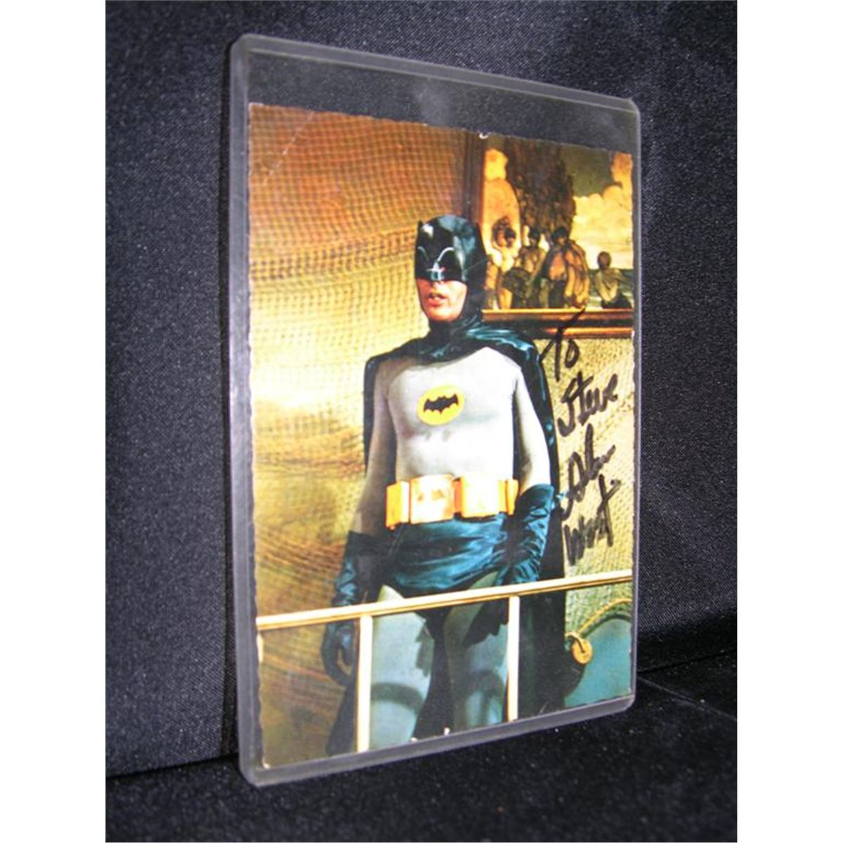 Large, rarely encountered Adam West Batman magazine from the 1960s which has been autographed on the back cover by West himself. Also included is a postcard, printed in Holland, depicting West in full Batman regalia. West has signed the card in black ink.