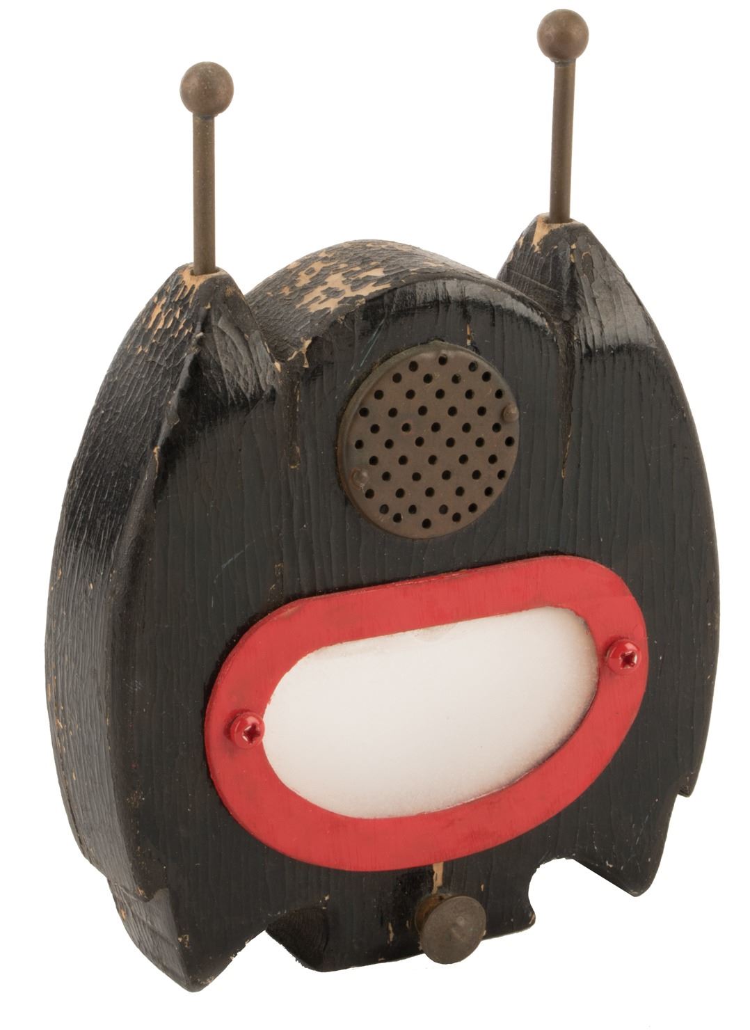 65. Adam West "Batman" Bat Radio from Batman. (TCF TV, 1966-1968) Vintage original bat-themed superhero tech prop radio shell. Constructed of carved wooden body embellished with 2-metal antennae, a static tuning knob, round speaker grill and a red-ringed light screen intended to be illuminated from within. The body is studio painted black. The prop has no back and there are no electronics present. Measuring 4 x 6 x 1 in. Exhibiting minor age, production wear and light paint rubbing. In vintage very good condition. Provenance: Profiles in History, Auction 32, July 31-Aug 1, 2008, Lot 712. $8,000 - $12,000