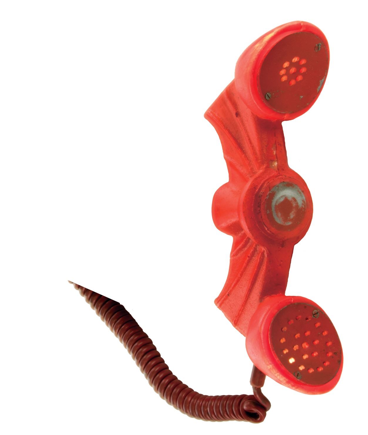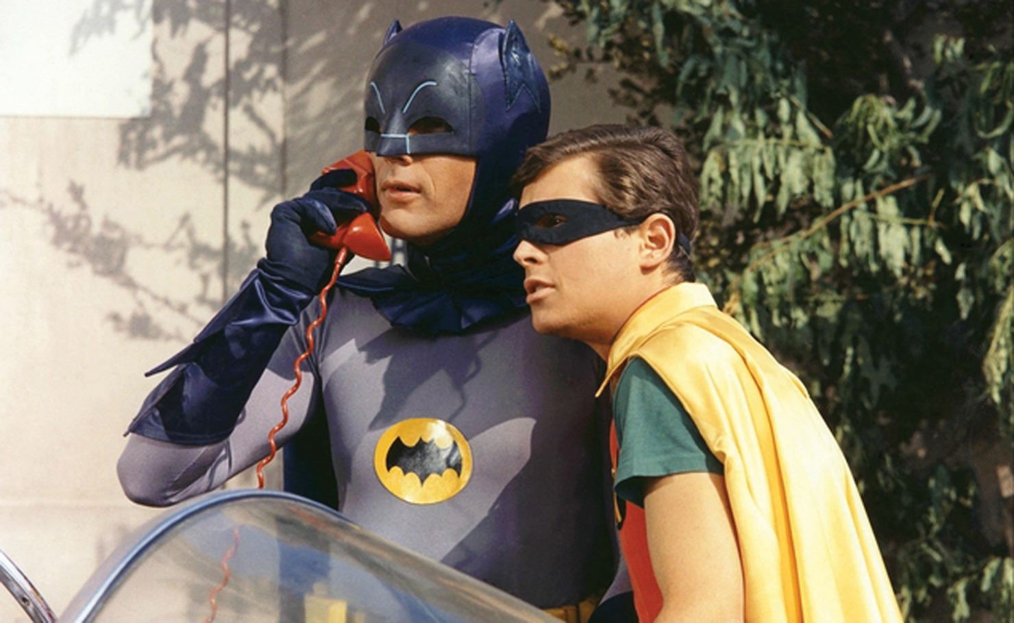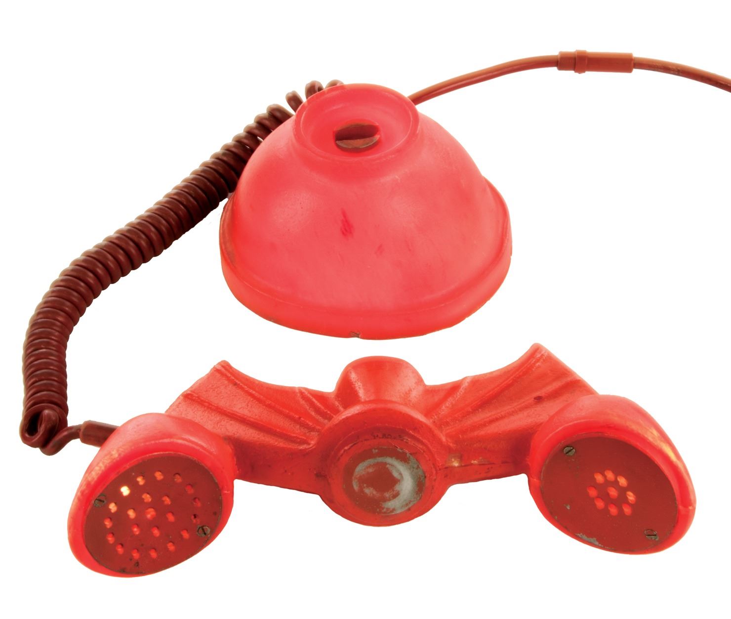 68. Adam West "Batman" hero working Batmobile Batphone from Batman. (TCF TV, 1966-68) While on patrol or in pursuit, this is the Batmobile Batphone that gives the Dynamic Duo instant access to the highest levels of law enforcement. Arguably the most famous fictional phone of all time, the Batphone is constructed of a translucent cast plastic painted red, with a bat form handset and a domed base. The handset features metal speaker and receiver grills, and is connected to the base with a coil cord. A magnet in the handset allows it to hang securely on the base when the Batmobile is in motion. When the power cord emanating from the base is plugged in, internal lightbulbs in the base and handset are illuminated, giving the piece its signature red alert glow. An incredible, futuristic gadget at the time of filming, this is the only hero working model known to exist. Measures 9 x 6 x 4.25 in. assembled. Includes 3- original lightbulbs (no longer functioning) with orange paint overspray remnants. Electronics tested and working. Accompanied by a LOA from series Art Director Serge Krizman. One of the most instantly recognizable signature superhero props in television history. Minor paint chipping and wear In vintage very good condition. $30,000 - $50,000