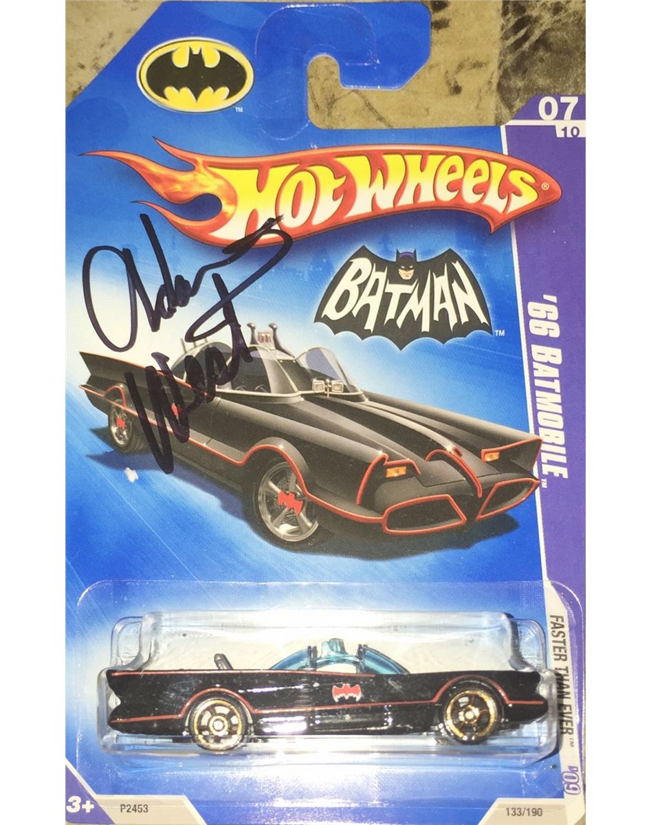 A Hot Wheels Lt edition still mint on card of the Batmobile signed by Adam West at the Hollywood Show