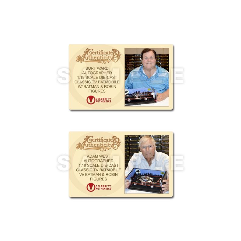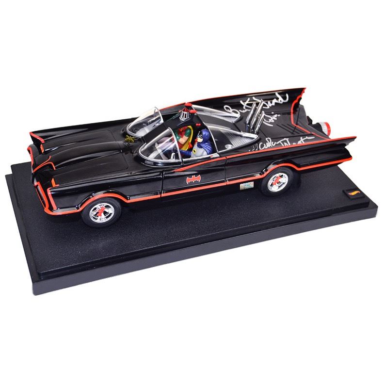 Holy die-cast, Batman! This iconic 1966 Batmobile in 1:18 scale Die-Cast from the classic 1966 Batman TV series has been personally hand-signed by Adam West and Burt Ward during their signings with Celebrity Authentics. This 1966 Batmobile by Hot Wheels has been created in 1:18 scale die-cast and even includes miniature Batman and with his trusted sidekick Robin that is sure to be a fantastic addition to your collection. Opening the door, trunk, and hood reveals a detailed interior and engine, too. Perfect for Batman and DC Comics collectors, this Batmobile measures approximately 11 1/4-inches long. "To the Batmobile, Robin!" Batmobile ships in its original presentation box, affixed with the Celebrity Authentics serial-numbered and tamper evident Authentication Hologram and includes Celebrity Authentics Certificates of Authenticity featuring a picture of Adam and Burt signing Batmobile. Stock image used for product images. Item ships with clean, unsmudged autograph in similar location. A truly impressive piece to enhance your die-cast collection!