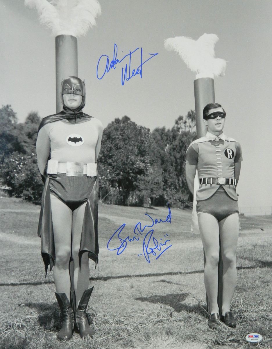 Adam West and Burt Ward signed Batman and Robin tied to poles 16x20 photo with 'Robin' inscription. Item comes with a PSA/DNA tamper evident numbered sticker and matching Certificate of Authenticity which can be verified online.