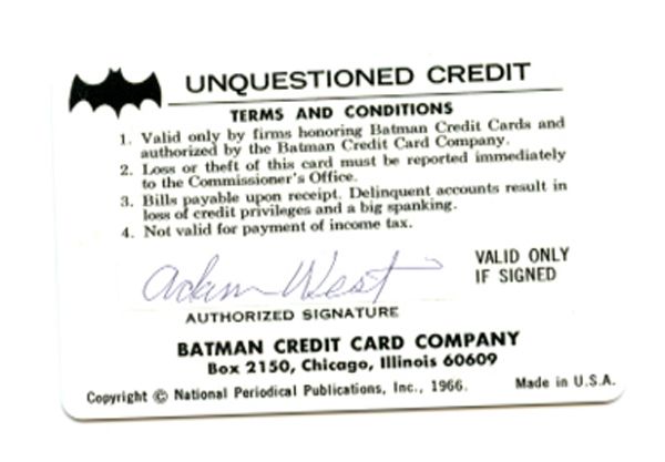 1966 original novelty "Batman" credit card that could only be gotten from the back of comic books at the time. The card has been signed in ballpoint ink during the 1980s in full by Adam West. It's a one-of-a-kind piece that would fabulous in anyone's collection. This item comes with a certificate of authenticity guaranteed for the life of the piece.