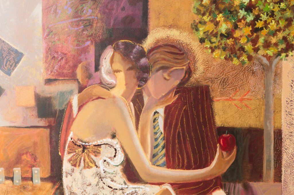 Adam & Eve is a limited edition serigraph on canvas by Sabzi. Numbered and hand signed by the artist! Includes Certificate of Authenticity! Measures approx. 40" x 50" (image).