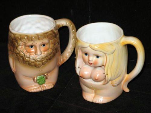 Adam and Eve Mugs, Japan, approx. 4" tall.