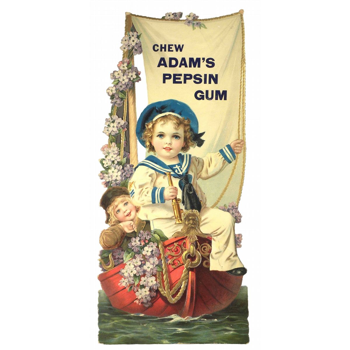 Adam's Pepsin Gum Embossed Die Cut Sign. Image of a little sailor boy in a boat. Very slight dog eared top corners otherwise near mint condition. 7 1/2 X 17 1/2 inches.