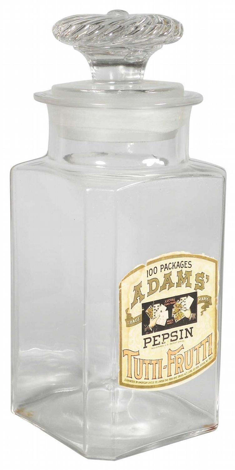 Adam's Pepsin Tutti-Frutti Gum Store Jar with ground glass lid. Desirable original paper label with bridge playing card hands. No chips or cracks. Slight staining and fading to label very good condition. 4 3/4 X 11 1/2 inches.