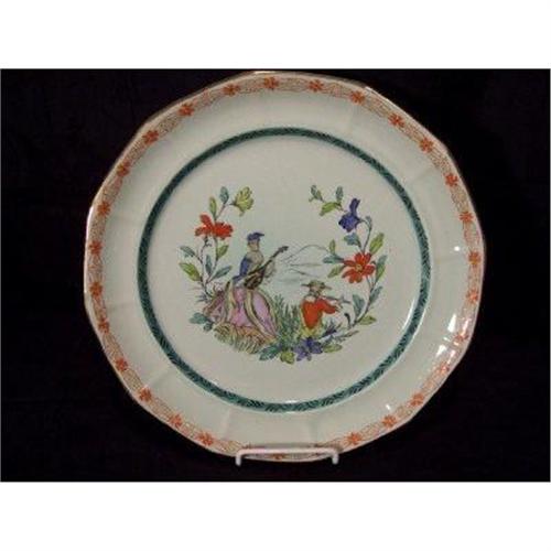 We have a 12 1/2" platter or charger by Adams of England. I have a large number of pieces in this pattern that I acquired at a recent estate sale. The pattern is called "The Piper" and has hand painted enamel decorating. Calyx Ware by Adams has well distinguished characteristics such as hand-enamelled colours on a greenish porcelain glaze. The dinner plates from the set are marked with a history of the Piper on the backs that reads: " A Copy of a pattern brought out when enameling in colours was first introduced in Staffordshire in or about 1755-1760, And is typical of the patterns made by the William Adams of that period"