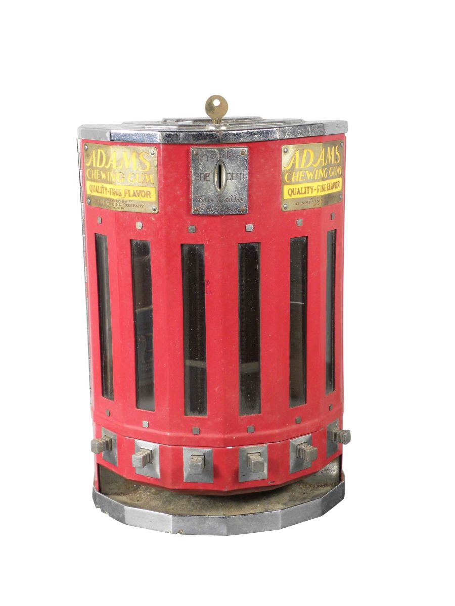 Adams Chewing Gum One Cent Coin Operated Dispenser. Maker Stewart & McGuire Inc. NY. Operated by the Illinois Vending Company. Good condition, comes with key. 10 X 15 1/2 X 6 inches.