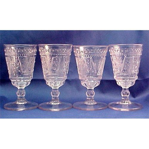 Antique EAPG goblets in the Horseshoe, Good Luck or Prayer Rug pattern made by Adams and Co. in 1881. These are the goblets with the knob or fancy stem. <p>The goblets are 6 1/8 inches tall. Three of the goblets are in excellent condition. The 4th goblet has a 1/2 inch flake off the bottom rim - please see photos. It is very rare to find a matched set of 4 EAPG goblets in any pattern.