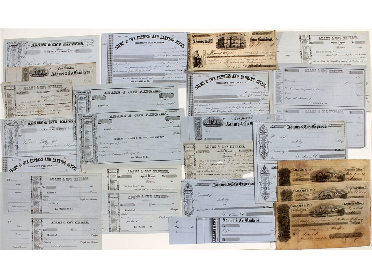 Lot of 29 includes 6 different issued pieces; Sacramento (1851), Marysville (1852, San Francisco (4). 13 Different unused forms from variouslocations, mostly San Francisco, Nevada City. Includes receipts for placer gold, coinage, etc. Three of the forms have 2 per page. 9 duplicates Some forms cite the many different Adams Express offices. Lynn Langdon Collection - HKA#65682