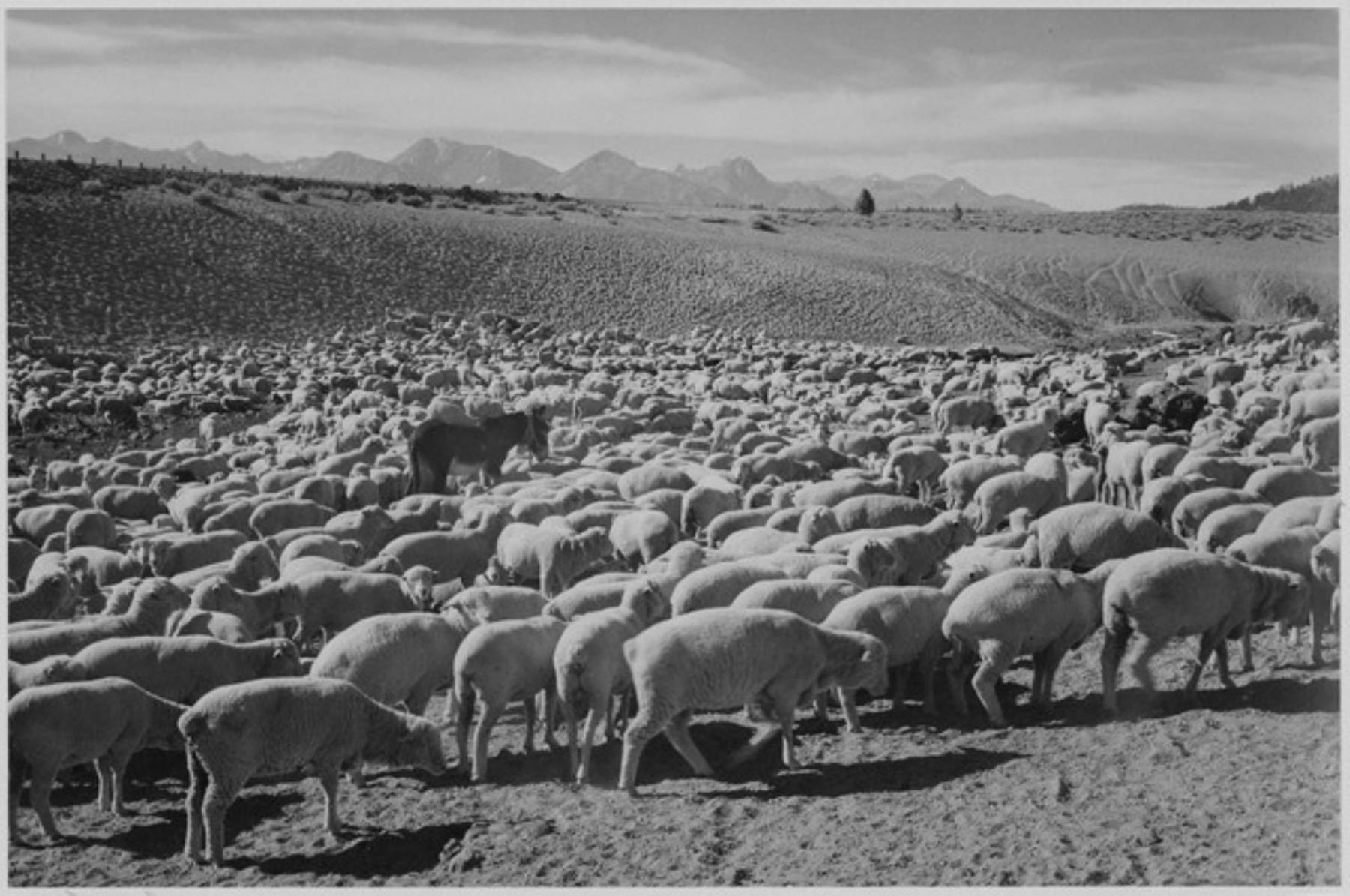 Artist: Ansel Adams - Title: Flock in Owens Valley, 1941 - Medium: Fine Art Reproduction Giclee on Canvas - Image Size: Approximately 13.25 inches x 20 inches - Unframed on Unstretched Canvas - Biography: As a conservationist, writer, teacher, and photographer, Ansel Adams has been profoundly influential on future generations of artists, photographers, and environmentalists. There can be little doubt that he produced some of the most iconic images of the great American wilderness. Following in a long tradition of American landscape photographers, including Carleton Watkins, Eadweard Muybridge, Timothy O'Sullivan, and William Henry Jackson, Adams brought landscape photography into the realm of modernism by fusing technical precision with a profound and abiding love of the natural world. His work has inspired a range of artists and photographers working in the landscape tradition, from Eliot Porter and Robert Adams, to Edward Burtynsky and Richard Misrach. The subject of countless documentaries, books, essays, and exhibitions, Adams's images appear on living room and museum walls, proving that his photographs of the great American landscape continue to resonate.
