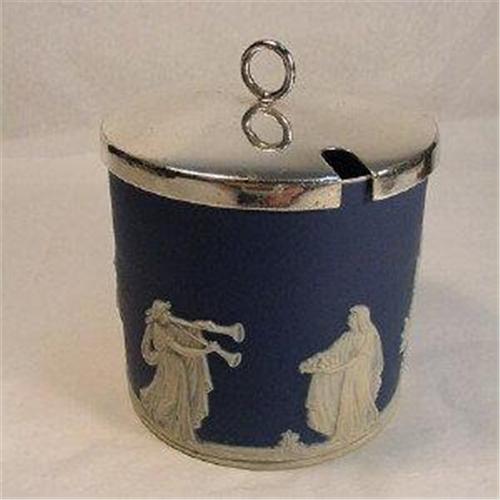 Just like Wedgwood, this little blue and white jasper ware honey or sugar pot has white classical figures and trees against a dark blue background. Made by Adams (Tunstall in the Staffordshire Potteries) and bearing their mark for the period 1896 to the early 20th century. Impressed marks ?K? and ?W?. The lid is silver plated, maker?s mark C.G & Co. Pot measures about 9.5 cm high and 7.5 cm diameter (3.3/4 inches by 3 inches). Excellent condition.
