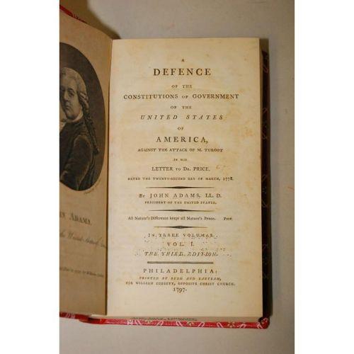 Adams, John. A Defence of the Constitutions of Government of the United States of America, Against the Attack of M. Turgot in His Letter to Dr. Price, Dated the Twenty-Second Day of March, 1778. Philadelphia: Printed By Budd and Bartram for William Cobbett, 1797. 8vo - over 7¾" - 9¾" tall. Hard Cover. Ex-Library. Very Good Condition. Third Edition. Engraved frontis in volume 1. In library bindings, with bindings & hinges tight. Occasional foxing, paper repair to one page of subscribers.