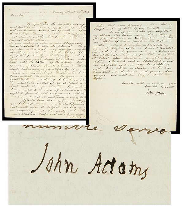 Adams, John (1735-1826) 2nd President of the United States (1797-1801). Letter signed, 2 pages (recto/verso), 8 x 10 in., Quincy, 30 April 1819. To an unidentified correspondent, with some of the finest John Adams content extant.