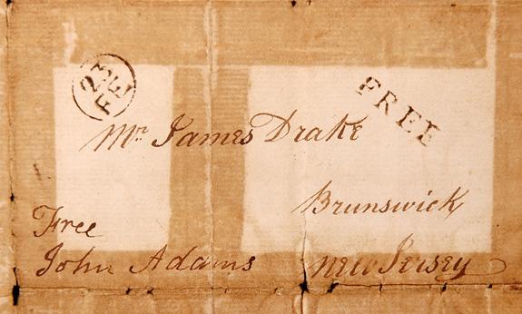 Adams. John. Autograph free frank signed as Vice President and President-elect. Addressed to Mr. James Drake in Brunswick, New Jersey, the address leaf is stamped "FREE" and also has a manuscript "Free" in Adams' hand. It is postmarked "23 FE" and the docket has the date "1797". On March 4, 1797, nine days after signing this free frank, Adams would be sworn in as the second President of the United States. The address leaf is soiled and has numerous marks from old tape repairs; a blank 2" strip at right is separated, not affecting the signature or any of the script. In spite of its flaws, this is a John Adams free frank and has some value, albeit nothing like it would have if it were in better condition.