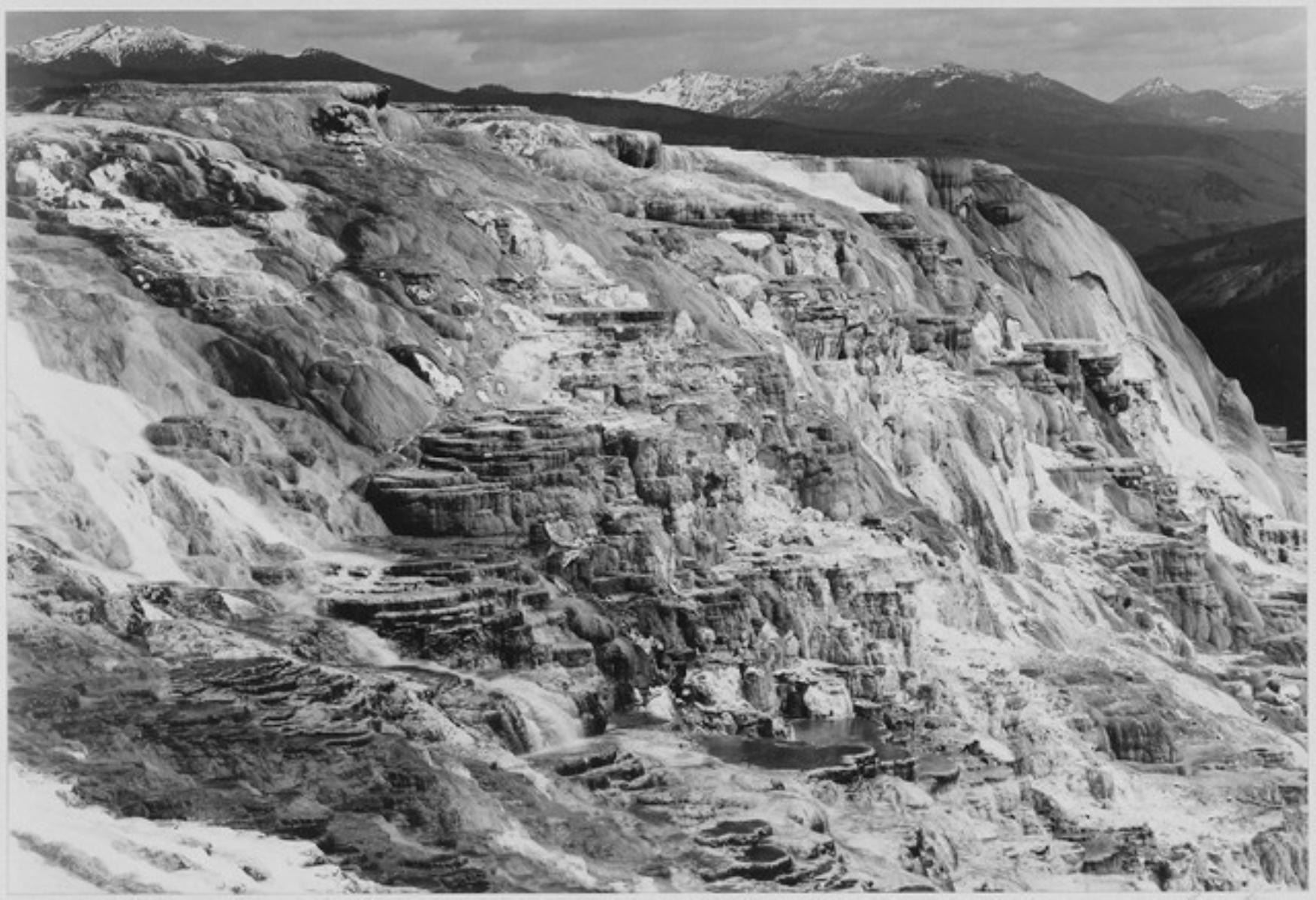 Artist: Ansel Adams - Title: Jupiter Terrace, Fountain Geyser Pool, Yellowstone National Park - Medium: Fine Art Reproduction Giclee on Canvas - Image Size: Approximately 22 inches x 32 inches - Unframed on Unstretched Canvas - Biography: As a conservationist, writer, teacher, and photographer, Ansel Adams has been profoundly influential on future generations of artists, photographers, and environmentalists. There can be little doubt that he produced some of the most iconic images of the great American wilderness. Following in a long tradition of American landscape photographers, including Carleton Watkins, Eadweard Muybridge, Timothy O'Sullivan, and William Henry Jackson, Adams brought landscape photography into the realm of modernism by fusing technical precision with a profound and abiding love of the natural world. His work has inspired a range of artists and photographers working in the landscape tradition, from Eliot Porter and Robert Adams, to Edward Burtynsky and Richard Misrach. The subject of countless documentaries, books, essays, and exhibitions, Adams's images appear on living room and museum walls, proving that his photographs of the great American landscape continue to resonate.