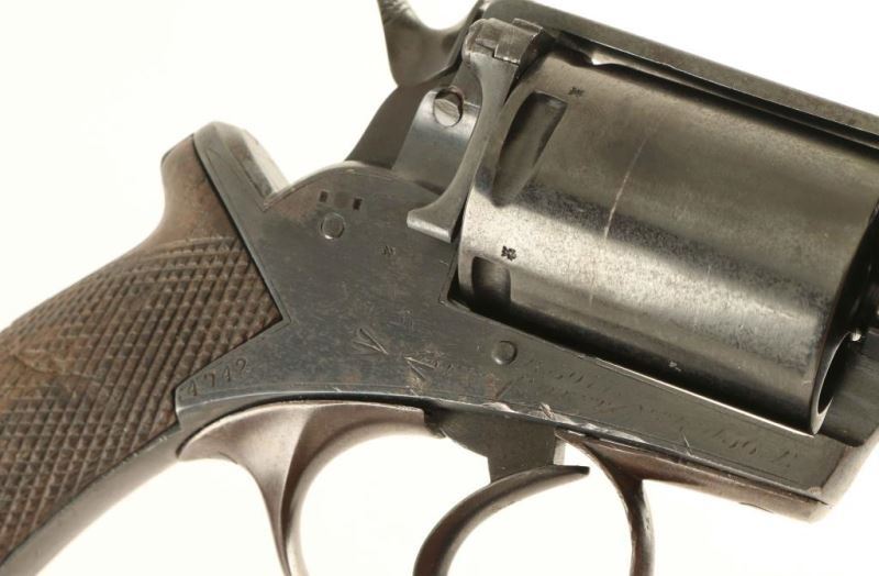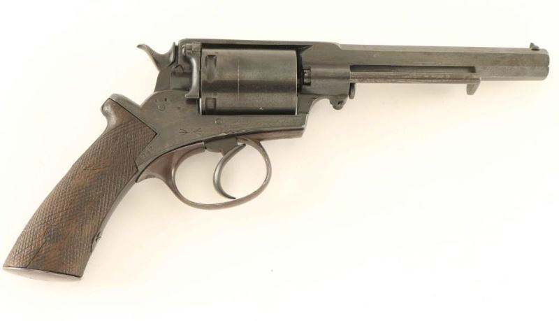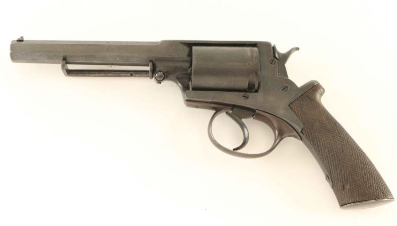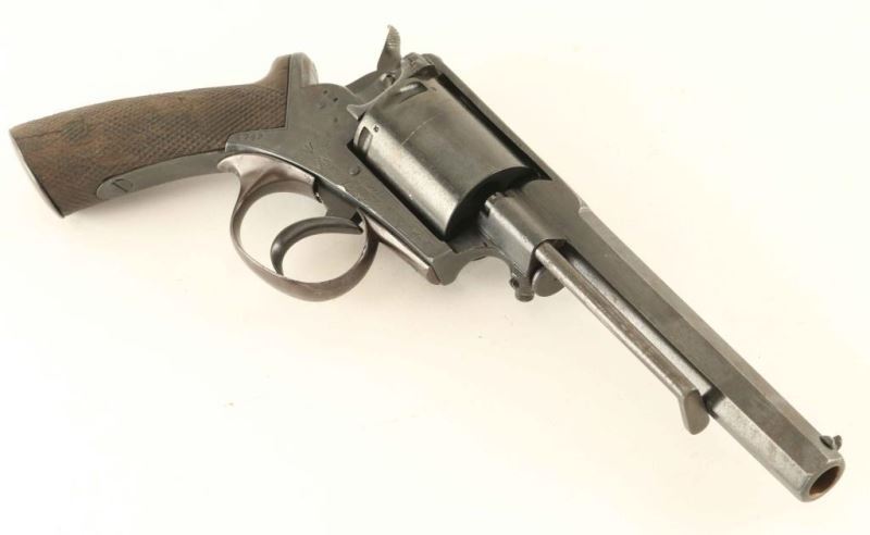 Early British military double action breechloading revolver chambered in .450 Adams, manufactured circa 1973. Features a blued finish, 5 3/4" octagon bbl that is integral to the frame, dovetailed blade front sight, 'v' notched rear sight, non-fluted five shot cylinder, ejector rod, rounded trigger, knurled hammer spur and checkered one-piece walnut grip. The serial numbers on the frame, ejector rod & cylinder are are matching. There appears to have been a retail or makers mark on the top strap but is no longer visible. The markings on the frame are faint but it is believed to read "ADAMS PATENT No 1 456" & "B.3077" among various military proofs. The revolver has been refinished and shows scattered oxidation & pin prick pitting. Action is good, the bore is very good, markings are fair and the wood grip is fair to good. Condition is NRA Good. ***Antique Firearm*** From The John F Sukey Collection