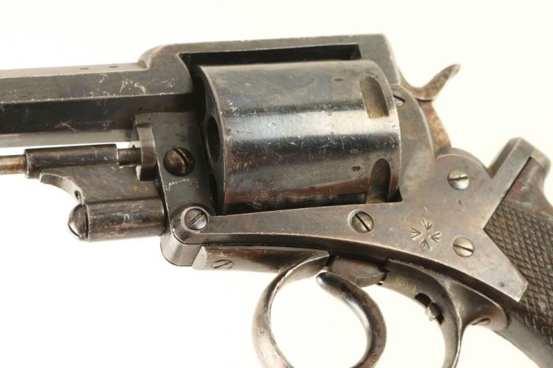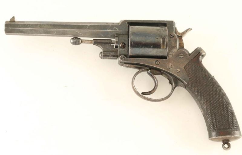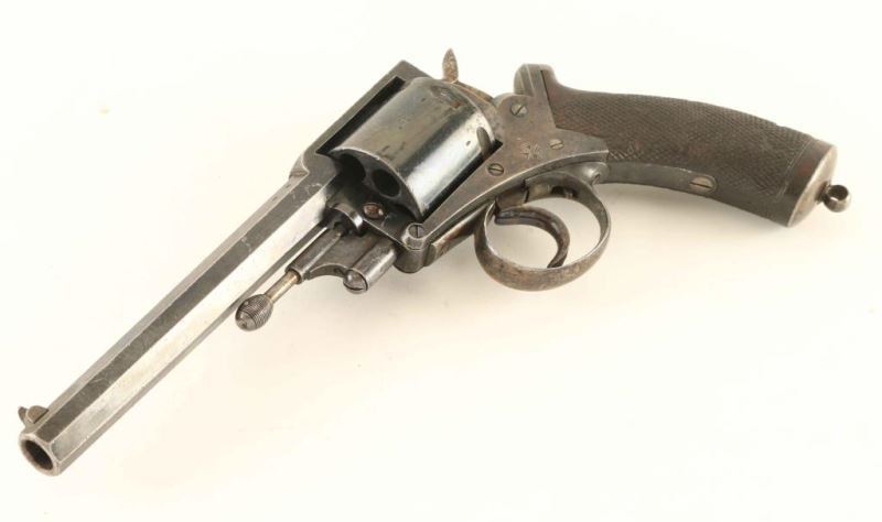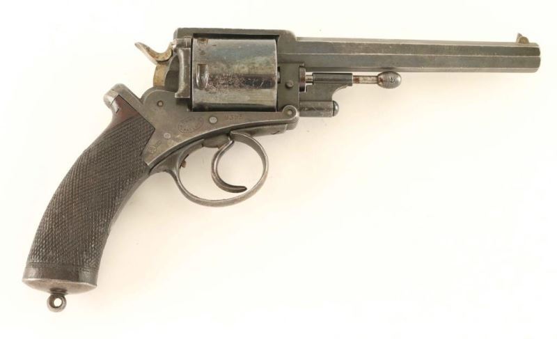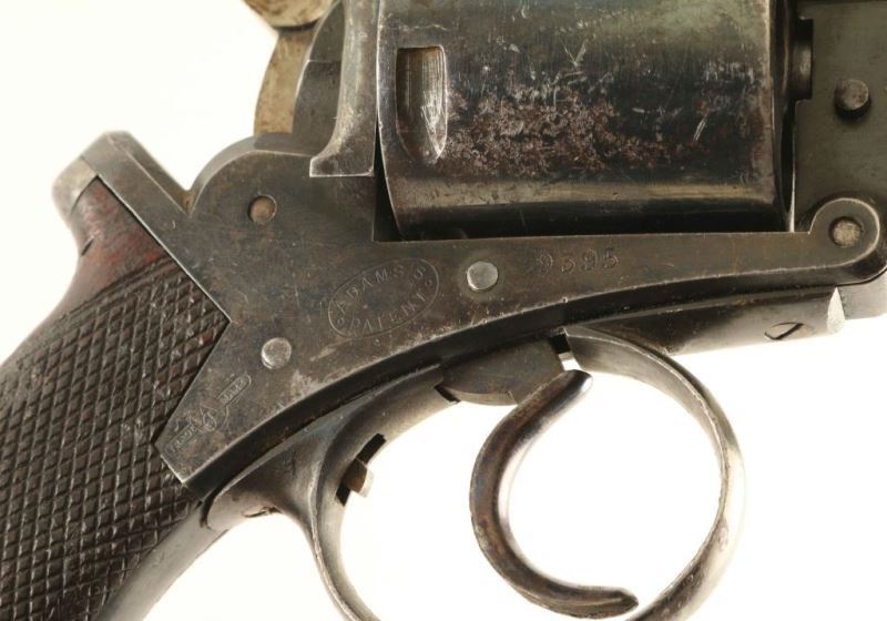 Early British military double action breechloading revolver chambered in .450 Adams. Features a blued finish, 6" octagon bbl, dovetailed blade front sight, 'v' notched rear sight, non-fluted six shot cylinder, pivoting ejector rod, rounded trigger, knurled hammer spur and checkered one-piece walnut grip with a metal grip cap(missing the lanyard ring). The serial numbers on the frame, barrel & cylinder are are matching. Marked "ADAM'S PATENT SMALL ARMS Co. 391 STRAND. LONDON" on the top of the barrel, "TRADE[superimposed 'AJ']MARK," ".ADAM'S.PATENT" inside an oval, & "9295" on the frame. The revolver displays a fine old reblued finish with approximately 60% finish intact overall showing honest wear. Action sound with solid lock-up, the bore is very good, markings are good and the wood grip is good. Condition is NRA Good++. ***Antique Firearm*** From The John F Sukey Collection