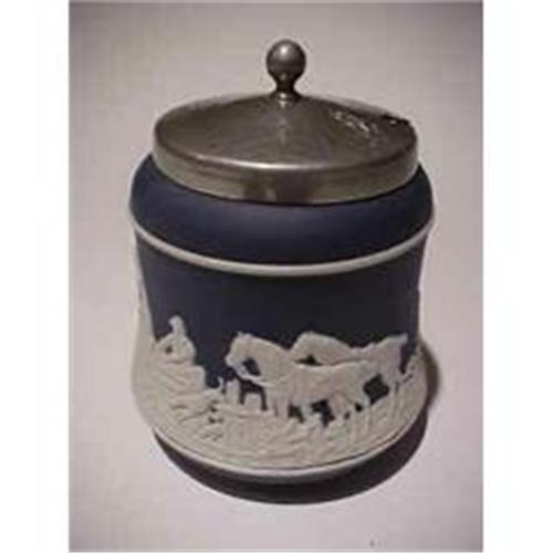 4 inch Tall ** Beautiful Hunt Scene - Horsemen, Horses, and Hounds ** Hammered National Silveroid Lid ** EstBd. 1657 - C 1896 Tunstall England ** Artist's Initials J. C. ** Excellent Condition