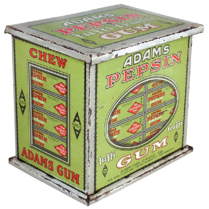 Adams Pepsin Gum counter display box w/hinged lid, some paint wear from use, o/wise in VG cond, 6"H x 7"W..