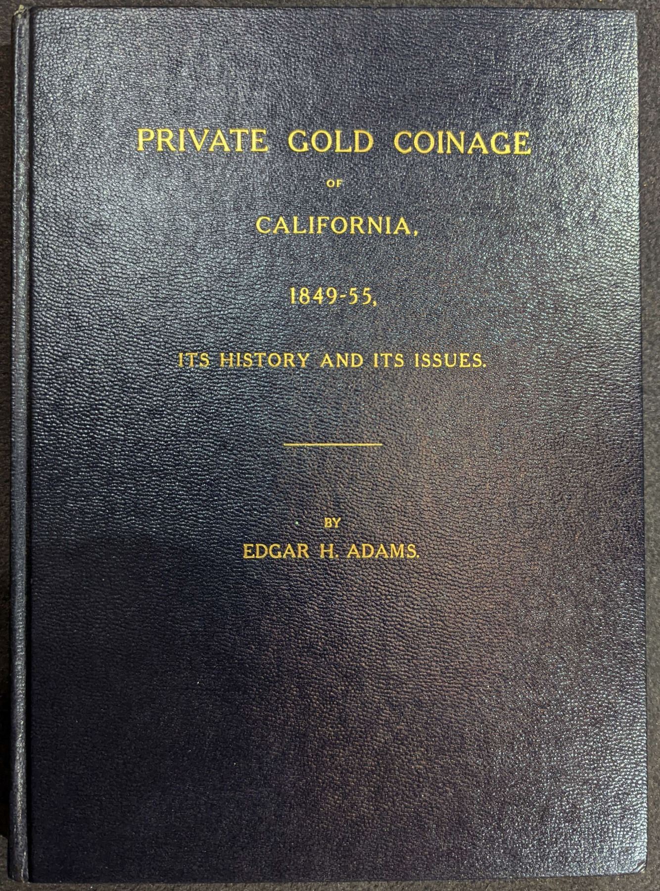 Adams, Edgar H. PRIVATE GOLD COINAGE OF CALIFORNIA 1849-55 - ITS HISTORY AND ITS ISSUES. Stackpole Books. 1965. 4to. (4), v, 110 pages. Mechanicsburg. Reprint of 1913 original. original textured black cloth, gilt. 6 plates. Fine. Introduction to the reprint by Q. David Bowers. More often than not, when the subject of 'pioneer gold' occurs in com collecting circles, it is spoken of somewhat vaguely. It is indeed a topic with which only the advanced numismatist tends to have more than a cursory acquaintance-and largely so because information about these curious coins has been nearly as scarce as the coins themselves. Primary sources of information-the private letters of territorial minters and their employees, correspondence among governmental officials, and 'public' documents are all but unavailable to the collector; and, without the efforts of a skilled numismatic researcher, in their archival state these scattered materials would probably discourage all but the most zealous private collector anyway. Secondary sources of information, among the best of which is the volume presented here, when they were of any real value in the first place, have generally been long out of print and their information available only to the advanced collector who sought out rare-and usually expensive-early editions. In reprinting Edgar H. Adams' 1913 classic book, Private Gold Coinage of California, 1849- 55, the present publisher offers a key source of enlightenment to the collector and numismatist alike. The volume is thorough but not scholarly, detailed but delightfully lively, and an orderly appraisal of the coinage which is largely free from the dull cataloguing that characterizes most numismatic studies. For this is not merely a coin book; it is a work of social history as well. You will come away from reading it with increased knowledge both of privately minted gold coins and of one of America's most adventurous and formative eras. And you will discover much about the economic, social, and other human conditions of the place where westward expansion saw its most vigorous fulfillment-the San Francisco of the 1850s, where much of the civilization of the American East transplanted itself in the course of less than a decade. From its story, skillfully reconstructed by Edgar H. Adams, who searched western libraries for firsthand information, comes a lasting understanding of why federal coinage took the forms it did in the far West in the years following the disappearance from circulation of the numerous issues of privately minted coins made from local gold. Lot weight: 1 lbs 10oz. Subject(s): United States Coinage.
