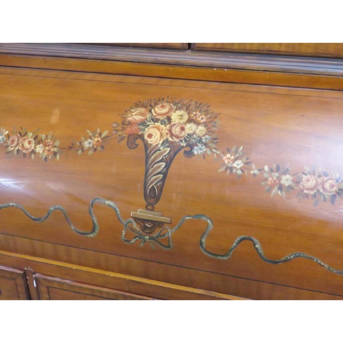 Paint decoration with flowers and swag. Roll top with fitted interior. Bookcase top with glass doors that open to wood shelves. 93"h. x 45 1/2"w. x 23 1/4"d.