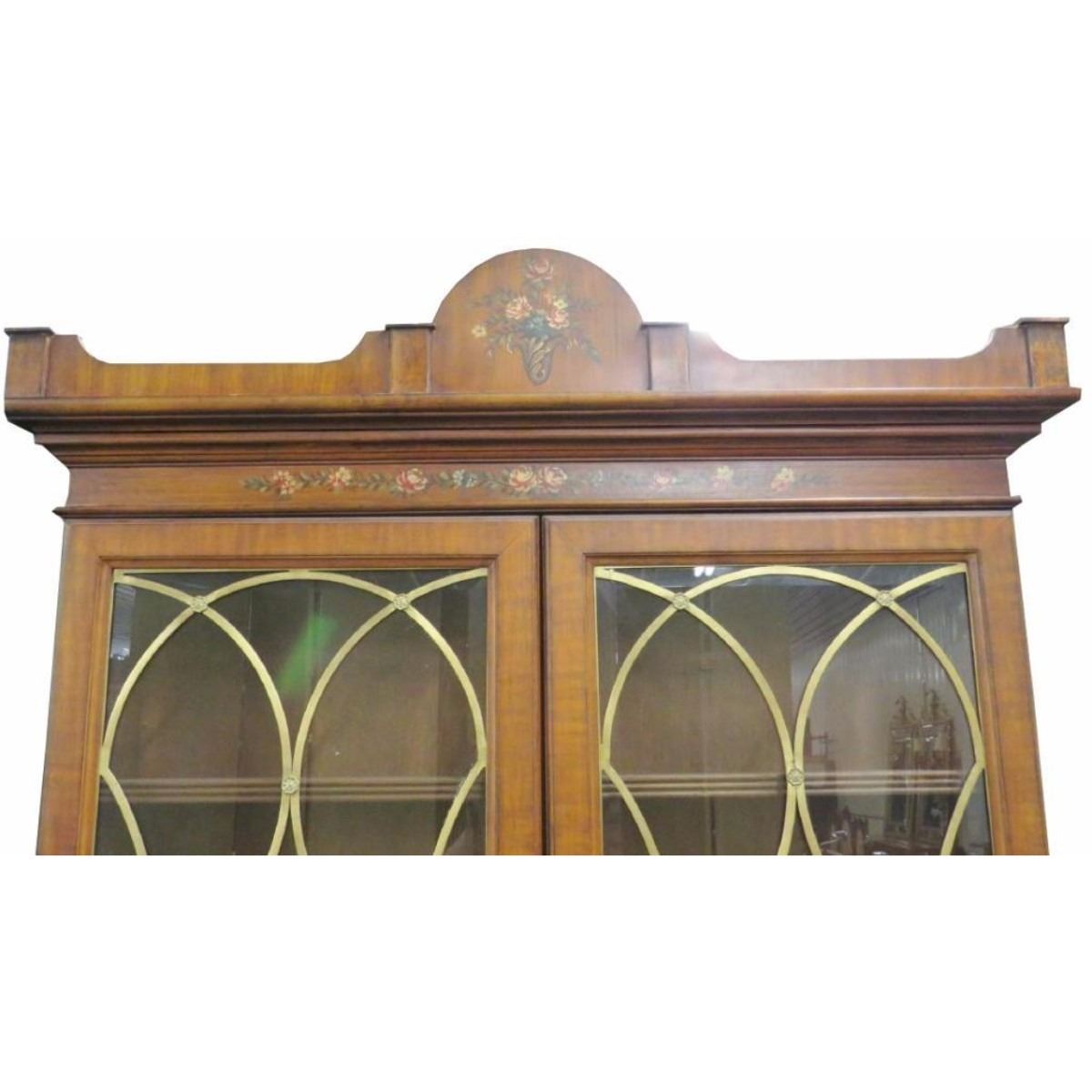 Paint decoration with flowers and swag. Roll top with fitted interior. Bookcase top with glass doors that open to wood shelves. 93"h. x 45 1/2"w. x 23 1/4"d.